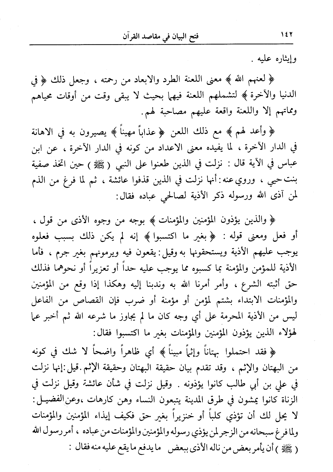 (فقد احتملوا بهتاناً وإثماً مبيناً) أي ظاهراً واضحاً لا شك في كونه من البهتان والإثم، وقد تقدم بيان حقيقة البهتان وحقيقة الإثم. قيل: إنها نزلت في علي بن أبي طالب كانوا يؤذونه. وقيل نزلت في شأن عائشة وقيل نزلت في الزناة كانوا يمشون في طرق المدينة يتبعون النساء وهن كارهات، وعن الفضيل: لا يحل لك أن تؤذي كلباً أو خنزيراً بغير حق فكيف إيذاء المؤمنين والمؤمنات ولما فرغ سبحانه من الزجر لمن يؤذي رسوله والمؤمنين والمؤمنات من عباده، أمر رسول الله (- صلى الله عليه وسلم -) أن يأمر بعض من ناله الأذى ببعض ما يدفع ما يقع عليه منه فقال: