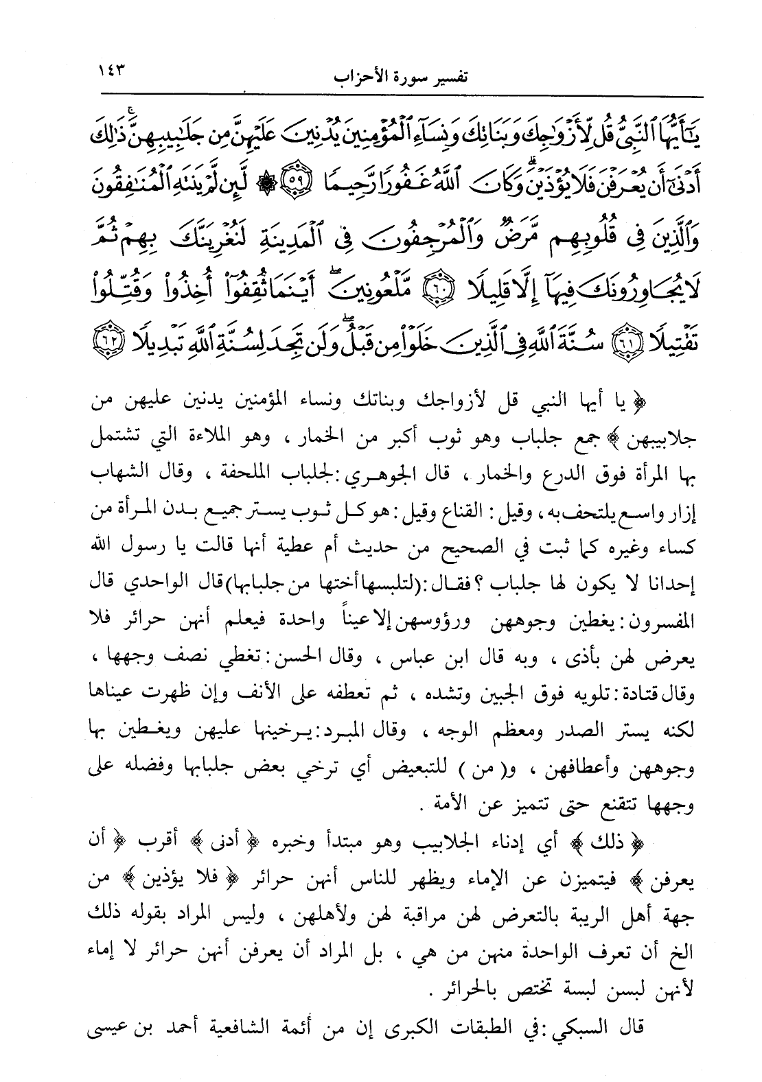 (يَا أَيُّهَا النَّبِيُّ قُلْ لِأَزْوَاجِكَ وَبَنَاتِكَ وَنِسَاءِ الْمُؤْمِنِينَ يُدْنِينَ عَلَيْهِنَّ مِنْ جَلَابِيبِهِنَّ) جمع جلباب وهو ثوب أكبر من الخمار، وهو الملاءة التي تشتمل بها المرأة فوق الدرع والخمار، قال الجوهري: لجلباب الملحفة، وقال الشهاب إزار واسع يلتحف به، وقيل: القناع وقيل: هو كل ثوب يستر جميع بدن المرأة من كساء وغيره كما ثبت في الصحيح من حديث أم عطية أنها قالت يا رسول الله إحدانا لا يكون لها جلباب؟ فقال: (لتلبسها أختها من جلبابها) قال الواحدي قال المفسرون: يغطين وجوههن ورؤوسهن إلا عيناً واحدة فيعلم أنهن حرائر فلا يعرض لهن بأذى، وبه قال ابن عباس، وقال الحسن: تغطي نصف وجهها، وقال قتادة: تلويه فوق الجبين وتشده، ثم تعطفه على الأنف وإن ظهرت عيناها لكنه يستر الصدر ومعظم الوجه، وقال البرد: يرخينها عليهن ويغطين بها وجوههن وأعطافهن، و (من) للتبعيض أي ترخي بعض جلبابها وفضله على وجهها تتقنع حتى تتميز عن الأمة.