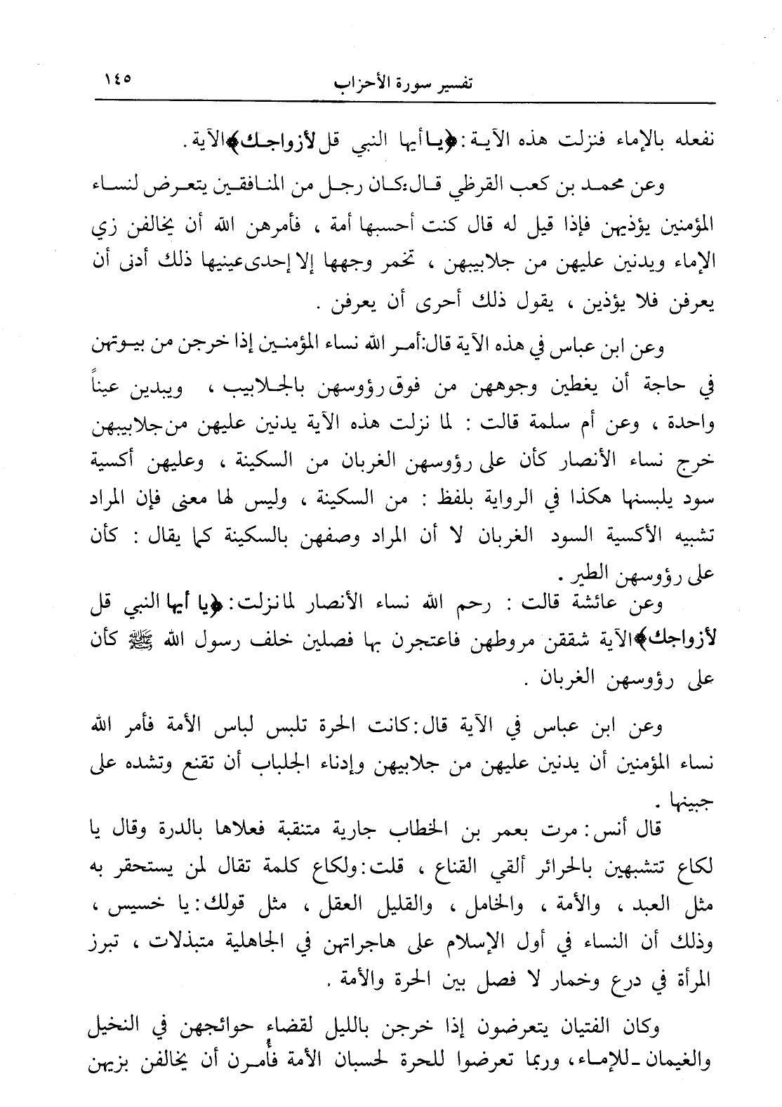وعن ابن عباس في الآية قال: كانت الحرة تلبس لباس الأمة فأمر الله نساء المؤمنين أن يدنين عليهن من جلابيبهن وإدناء الجلباب أن تقنع وتشده على جبينها.