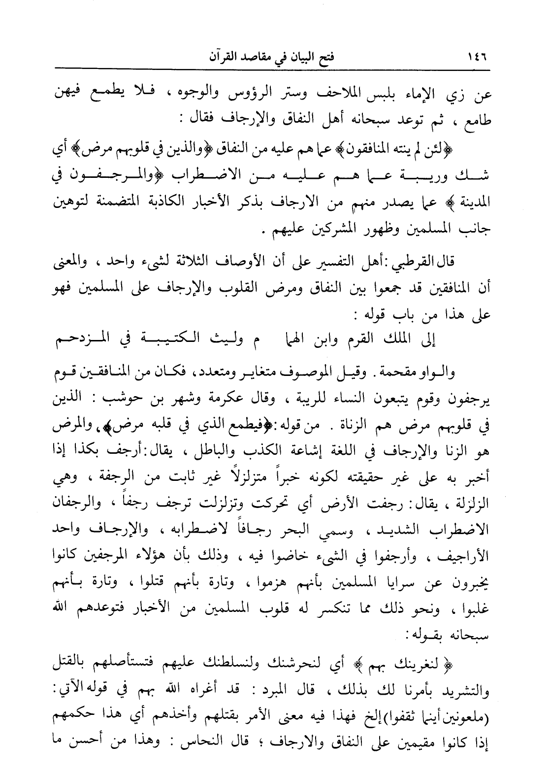 والواو مقحمة. وقيل الموصوف متغاير ومتعدد، فكان من المنافقين قوم يرجفون وقوم يتبعون النساء للريبة، وقال عكرمة وشهر بن حوشب: الذين في قلوبهم مرض هم الزناة. من قوله: (فيطمع الذي في قلبه مرض)، والمرض هو الزنا والإرجاف في اللغة إشاعة الكذب والباطل، يقال: أرجف بكذا إذا أخبر به على غير حقيقته لكونه خبراً متزلزلاً غير ثابت من الرجفة، وهي الزلزلة، يقال: رجفت الأرض أي تحركت وتزلزلت ترجف رجفاً، والرجفان الاضطراب الشديد، وسمي البحر رجافاً لاضطرابه، والإرجاف واحد الأراجيف، وأرجفوا في الشيء خاضوا فيه، وذلك بأن هؤلاء المرجفين كانوا يخبرون عن سرايا المسلمين بأنهم هزموا، وتارة بأنهم قتلوا، وتارة بأنهم غلبوا، ونحو ذلك مما تنكسر له قلوب المسلمين من الأخبار فتوعدهم الله سبحانه بقوله: