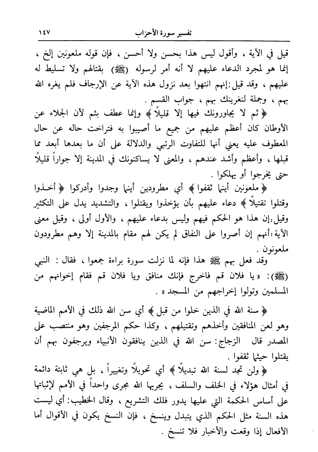 (ولن تجد لسنة الله تبديلاً) أي تحويلاً وتغييراً، بل هي ثابتة دائمة في أمثال هؤلاء في الخلف والسلف، يجريها الله مجرى واحداً في الأمم لإثباتها على أساس الحكمة التي عليها يدور فلك التشريع، وقال الخطيب: أي ليست هذه السنة مثل الحكم الذي يتبدل وينسخ، فإن النسخ يكون في الأقوال أما الأفعال إذا وقعت والأخبار فلا تنسخ.