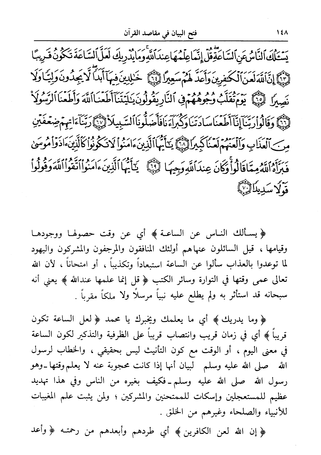 يَسْأَلُكَ النَّاسُ عَنِ السَّاعَةِ قُلْ إِنَّمَا عِلْمُهَا عِنْدَ اللَّهِ وَمَا يُدْرِيكَ لَعَلَّ السَّاعَةَ تَكُونُ قَرِيبًا (63) إِنَّ اللَّهَ لَعَنَ الْكَافِرِينَ وَأَعَدَّ لَهُمْ سَعِيرًا (64) خَالِدِينَ فِيهَا أَبَدًا لَا يَجِدُونَ وَلِيًّا وَلَا نَصِيرًا (65) يَوْمَ تُقَلَّبُ وُجُوهُهُمْ فِي النَّارِ يَقُولُونَ يَا لَيْتَنَا أَطَعْنَا اللَّهَ وَأَطَعْنَا الرَّسُولَا (66) وَقَالُوا رَبَّنَا إِنَّا أَطَعْنَا سَادَتَنَا وَكُبَرَاءَنَا فَأَضَلُّونَا السَّبِيلَا (67) رَبَّنَا آتِهِمْ ضِعْفَيْنِ مِنَ الْعَذَابِ وَالْعَنْهُمْ لَعْنًا كَبِيرًا (68) يَا أَيُّهَا الَّذِينَ آمَنُوا لَا تَكُونُوا كَالَّذِينَ آذَوْا مُوسَى فَبَرَّأَهُ اللَّهُ مِمَّا قَالُوا وَكَانَ عِنْدَ اللَّهِ وَجِيهًا (69) يَا أَيُّهَا الَّذِينَ آمَنُوا اتَّقُوا اللَّهَ وَقُولُوا قَوْلًا سَدِيدًا (70)