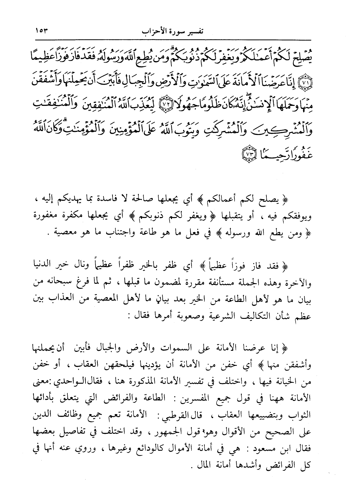 يُصْلِحْ لَكُمْ أَعْمَالَكُمْ وَيَغْفِرْ لَكُمْ ذُنُوبَكُمْ وَمَنْ يُطِعِ اللَّهَ وَرَسُولَهُ فَقَدْ فَازَ فَوْزًا عَظِيمًا (71) إِنَّا عَرَضْنَا الْأَمَانَةَ عَلَى السَّمَاوَاتِ وَالْأَرْضِ وَالْجِبَالِ فَأَبَيْنَ أَنْ يَحْمِلْنَهَا وَأَشْفَقْنَ مِنْهَا وَحَمَلَهَا الْإِنْسَانُ إِنَّهُ كَانَ ظَلُومًا جَهُولًا (72) لِيُعَذِّبَ اللَّهُ الْمُنَافِقِينَ وَالْمُنَافِقَاتِ وَالْمُشْرِكِينَ وَالْمُشْرِكَاتِ وَيَتُوبَ اللَّهُ عَلَى الْمُؤْمِنِينَ وَالْمُؤْمِنَاتِ وَكَانَ اللَّهُ غَفُورًا رَحِيمًا (73)