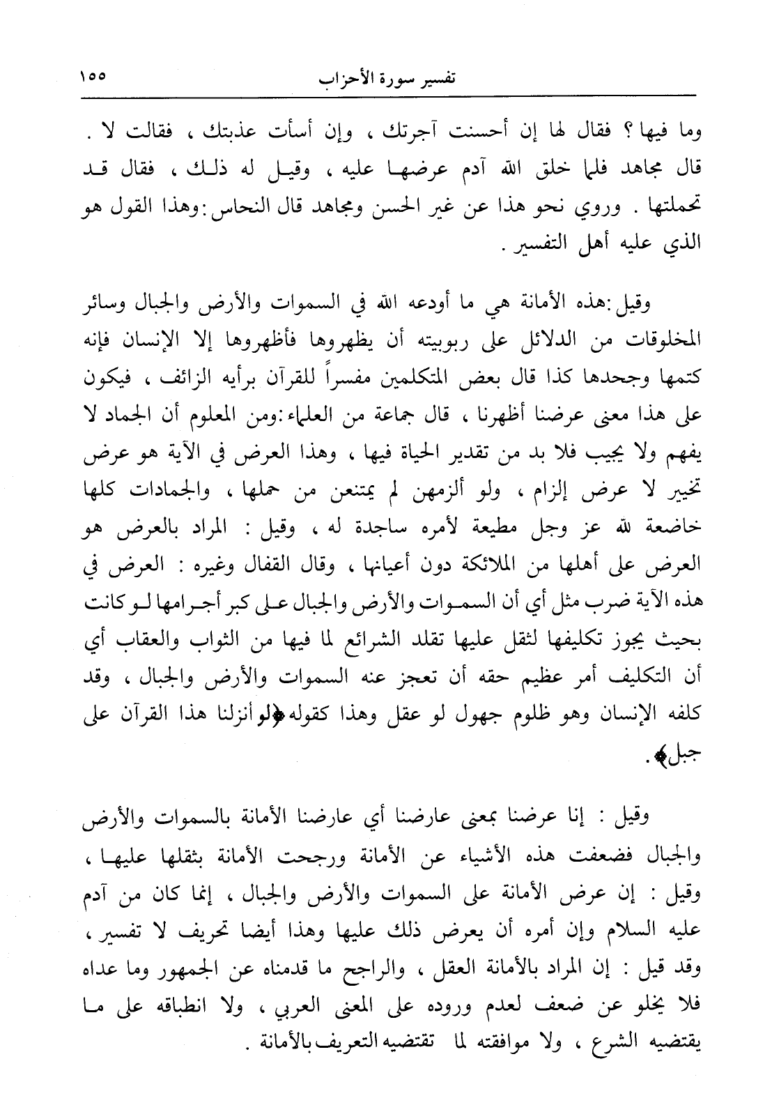 وقيل: هذه الأمانة هي ما أودعه الله في السموات والأرض والجبال وسائر المخلوقات من الدلائل على ربوبيته أن يظهروها فأظهروها إلا الإنسان فإنه كتمها وجحدها كذا قال بعض المتكلمين مفسراً للقرآن برأيه الزائف، فيكون على هذا معنى عرضنا أظهرنا، قال جماعة من العلماء: ومن المعلوم أن الجماد لا يفهم ولا يجيب فلا بد من تقدير الحياة فيها، وهذا العرض في الآية هو عرض تخيير لا عرض إلزام، ولو ألزمهن لم يمتنعن من حملها، والجمادات كلها خاضعة لله عز وجل مطيعة لأمره ساجدة له، وقيل: المراد بالعرض هو العرض على أهلها من الملائكة دون أعيانها، وقال القفال وغيره: العرض في هذه الآية ضرب مثل أي أن السموات والأرض والجبال على كبر أجرامها لو كانت بحيث يجوز تكليفها لثقل عليها تقلد الشرائع لما فيها من الثواب والعقاب أي أن التكليف أمر عظيم حقه أن تعجز عنه السموات والأرض والجبال، وقد كلفه الإنسان وهو ظلوم جهول لو عقل وهذا كقوله (لو أنزلنا هذا القرآن على جبل).