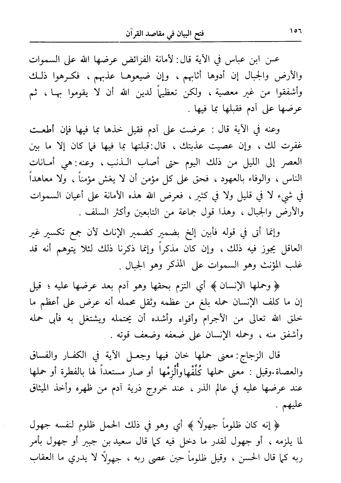عن ابن عباس في الآية قال: لأمانة الفرائض عرضها الله على السموات والأرض والجبال إن أدوها أثابهم، وإن ضيعوها عذبهم، فكرهوا ذلك وأشفقوا من غير معصية، ولكن تعظيماً لدين الله أن لا يقوموا بها، ثم عرضها على آدم فقبلها بما فيها.