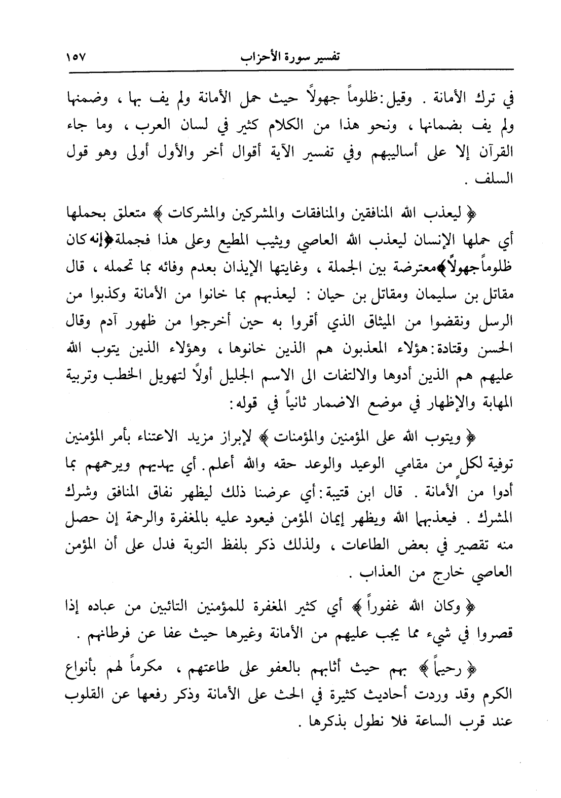 (رحيماً) بهم حيث أثابهم بالعفو على طاعتهم، مكرماً لهم بأنواع الكرم وقد وردت أحاديث كثيرة في الحث على الأمانة وذكر رفعها عن القلوب عند قرب الساعة فلا نطول بذكرها.