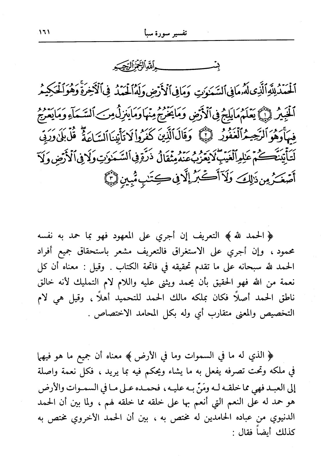 الْحَمْدُ لِلَّهِ الَّذِي لَهُ مَا فِي السَّمَاوَاتِ وَمَا فِي الْأَرْضِ وَلَهُ الْحَمْدُ فِي الْآخِرَةِ وَهُوَ الْحَكِيمُ الْخَبِيرُ (1) يَعْلَمُ مَا يَلِجُ فِي الْأَرْضِ وَمَا يَخْرُجُ مِنْهَا وَمَا يَنْزِلُ مِنَ السَّمَاءِ وَمَا يَعْرُجُ فِيهَا وَهُوَ الرَّحِيمُ الْغَفُورُ (2) وَقَالَ الَّذِينَ كَفَرُوا لَا تَأْتِينَا السَّاعَةُ قُلْ بَلَى وَرَبِّي لَتَأْتِيَنَّكُمْ عَالِمِ الْغَيْبِ لَا يَعْزُبُ عَنْهُ مِثْقَالُ ذَرَّةٍ فِي السَّمَاوَاتِ وَلَا فِي الْأَرْضِ وَلَا أَصْغَرُ مِنْ ذَلِكَ وَلَا أَكْبَرُ إِلَّا فِي كِتَابٍ مُبِينٍ (3)