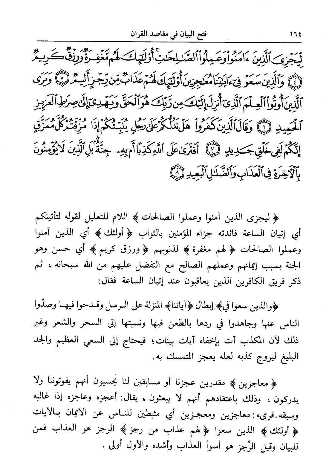 لِيَجْزِيَ الَّذِينَ آمَنُوا وَعَمِلُوا الصَّالِحَاتِ أُولَئِكَ لَهُمْ مَغْفِرَةٌ وَرِزْقٌ كَرِيمٌ (4) وَالَّذِينَ سَعَوْا فِي آيَاتِنَا مُعَاجِزِينَ أُولَئِكَ لَهُمْ عَذَابٌ مِنْ رِجْزٍ أَلِيمٌ (5) وَيَرَى الَّذِينَ أُوتُوا الْعِلْمَ الَّذِي أُنْزِلَ إِلَيْكَ مِنْ رَبِّكَ هُوَ الْحَقَّ وَيَهْدِي إِلَى صِرَاطِ الْعَزِيزِ الْحَمِيدِ (6) وَقَالَ الَّذِينَ كَفَرُوا هَلْ نَدُلُّكُمْ عَلَى رَجُلٍ يُنَبِّئُكُمْ إِذَا مُزِّقْتُمْ كُلَّ مُمَزَّقٍ إِنَّكُمْ لَفِي خَلْقٍ جَدِيدٍ (7) أَفْتَرَى عَلَى اللَّهِ كَذِبًا أَمْ بِهِ جِنَّةٌ بَلِ الَّذِينَ لَا يُؤْمِنُونَ بِالْآخِرَةِ فِي الْعَذَابِ وَالضَّلَالِ الْبَعِيدِ (8)