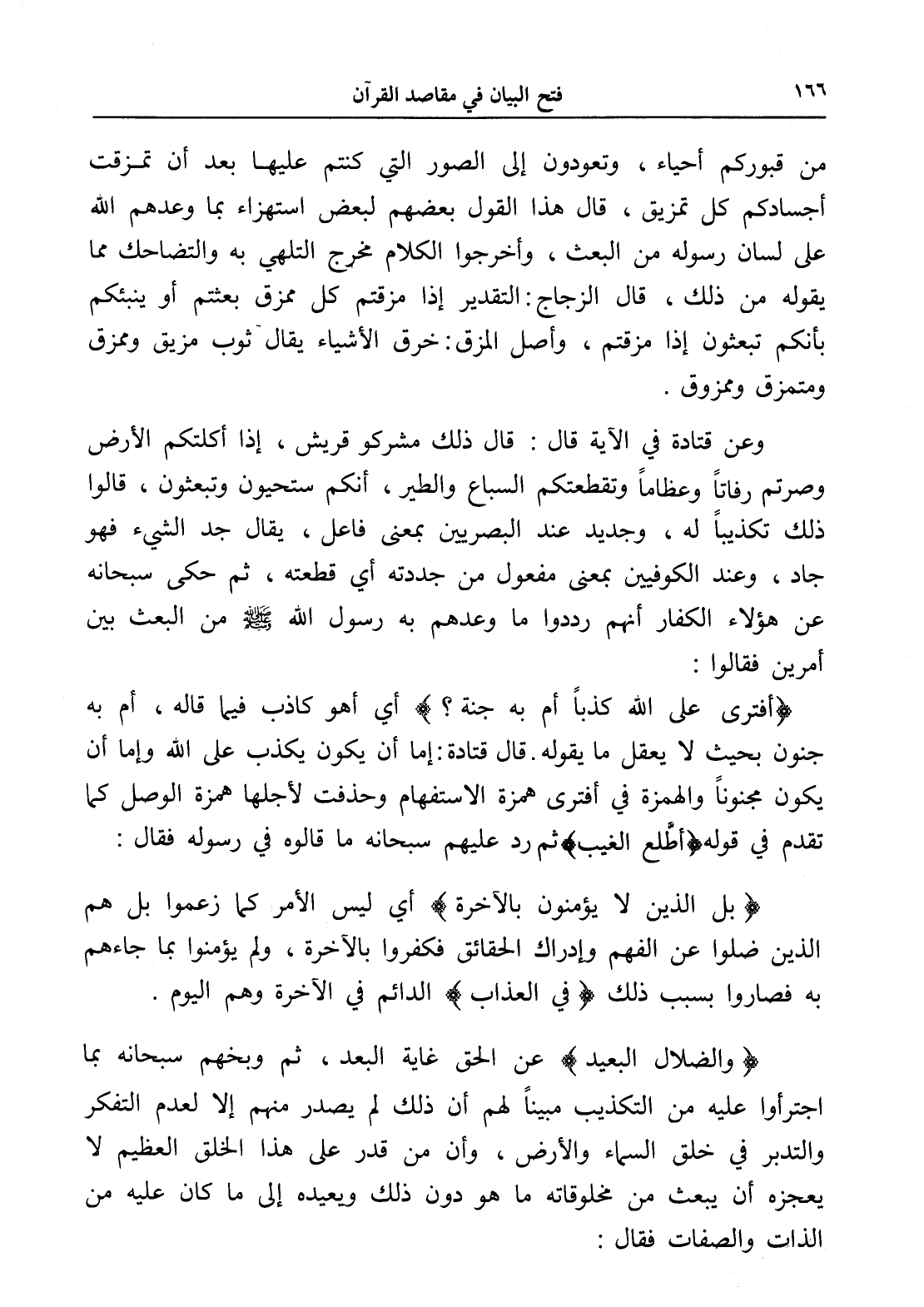 (والضلال البعيد) عن الحق غاية البعد، ثم وبخهم سبحانه بما اجترأوا عليه من التكذيب مبيناً لهم أن ذلك لم يصدر منهم إلا لعدم التفكر والتدبر في خلق السماء والأرض، وأن من قدر على هذا الخلق العظيم لا يعجزه أن يبعث من مخلوقاته ما هو دون ذلك ويعيده إلى ما كان عليه من الذات والصفات فقال: