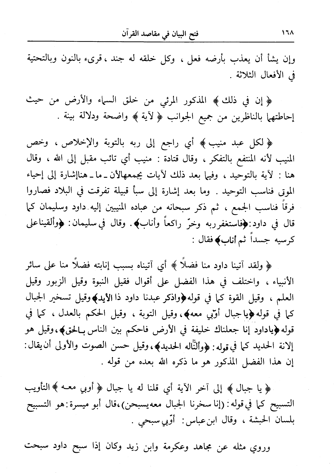 (ولقد آتينا داود منا فضلاً) أي آتيناه بسبب إنابته فضلاً منا على سائر الأنبياء، واختلف في هذا الفضل على أقوال فقيل النبوة وقيل الزبور وقيل العلم، وقيل القوة كما في قوله (واذكر عبدنا داود ذا الأيد) وقيل تسخير الجبال كما في قوله (يا جبال أوّبي معه)، وقيل التوبة، وقيل الحكم بالعدل، كما في قوله (يا داود إنا جعلناك خليفة في الأرض فاحكم بين الناس بالحق)، وقيل هو إلانة الحديد كما في قوله: (وألنا له الحديد)، وقيل حسن الصوت والأولى أن يقال: إن هذا الفضل المذكور هو ما ذكره الله بعده من قوله.