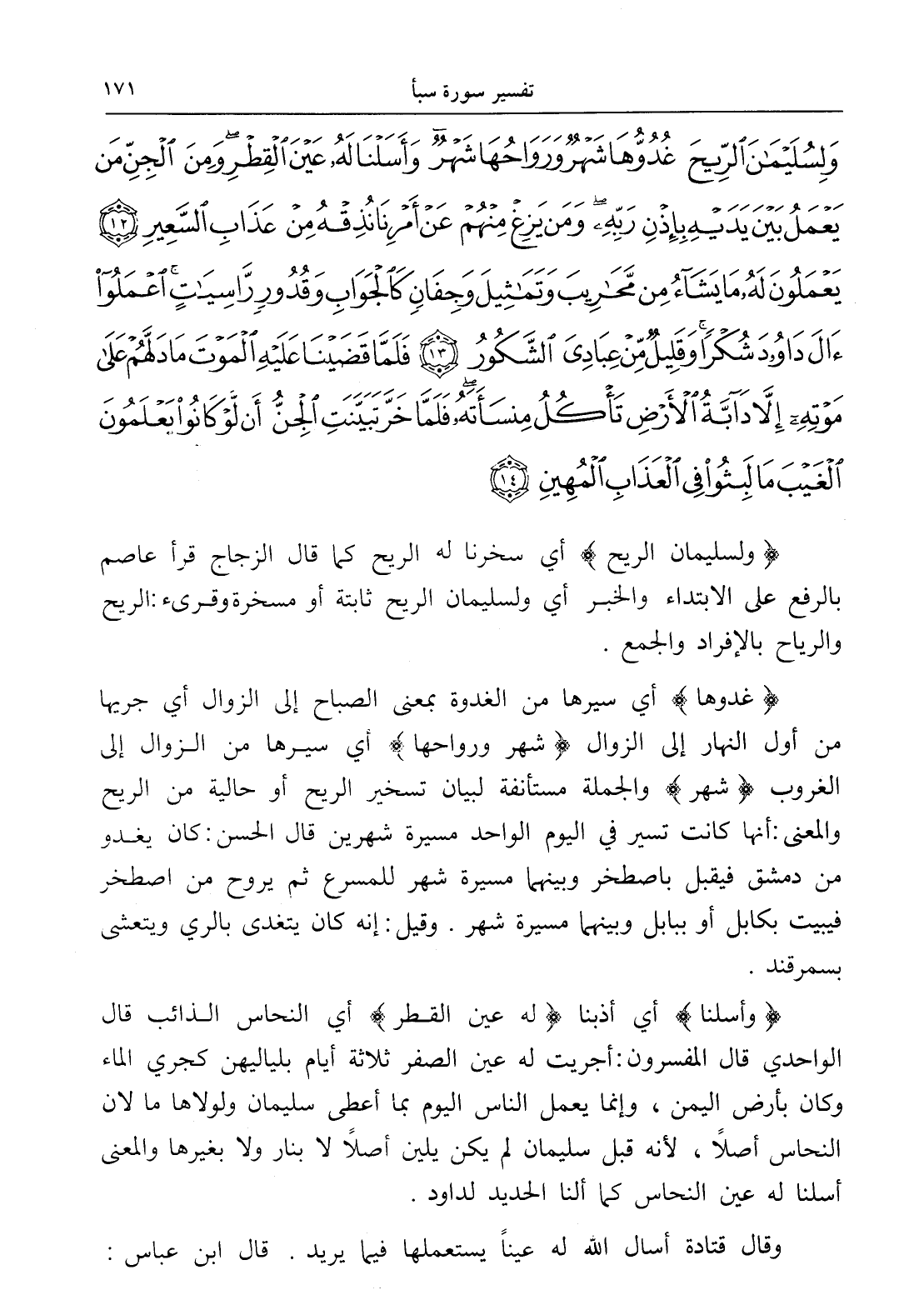 وَلِسُلَيْمَانَ الرِّيحَ غُدُوُّهَا شَهْرٌ وَرَوَاحُهَا شَهْرٌ وَأَسَلْنَا لَهُ عَيْنَ الْقِطْرِ وَمِنَ الْجِنِّ مَنْ يَعْمَلُ بَيْنَ يَدَيْهِ بِإِذْنِ رَبِّهِ وَمَنْ يَزِغْ مِنْهُمْ عَنْ أَمْرِنَا نُذِقْهُ مِنْ عَذَابِ السَّعِيرِ (12) يَعْمَلُونَ لَهُ مَا يَشَاءُ مِنْ مَحَارِيبَ وَتَمَاثِيلَ وَجِفَانٍ كَالْجَوَابِ وَقُدُورٍ رَاسِيَاتٍ اعْمَلُوا آلَ دَاوُودَ شُكْرًا وَقَلِيلٌ مِنْ عِبَادِيَ الشَّكُورُ (13) فَلَمَّا قَضَيْنَا عَلَيْهِ الْمَوْتَ مَا دَلَّهُمْ عَلَى مَوْتِهِ إِلَّا دَابَّةُ الْأَرْضِ تَأْكُلُ مِنْسَأَتَهُ فَلَمَّا خَرَّ تَبَيَّنَتِ الْجِنُّ أَنْ لَوْ كَانُوا يَعْلَمُونَ الْغَيْبَ مَا لَبِثُوا فِي الْعَذَابِ الْمُهِينِ (14)