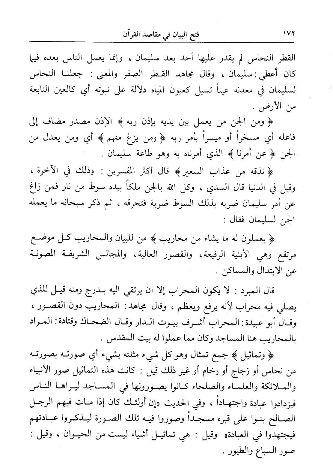(يعملون له ما يشاء من محاريب) من للبيان والمحاريب كل موضع مرتفع وهي الأبنية الرفيعة، والقصور العالية، والمجالس الشريفة المصونة عن الابتذال والمساكن.