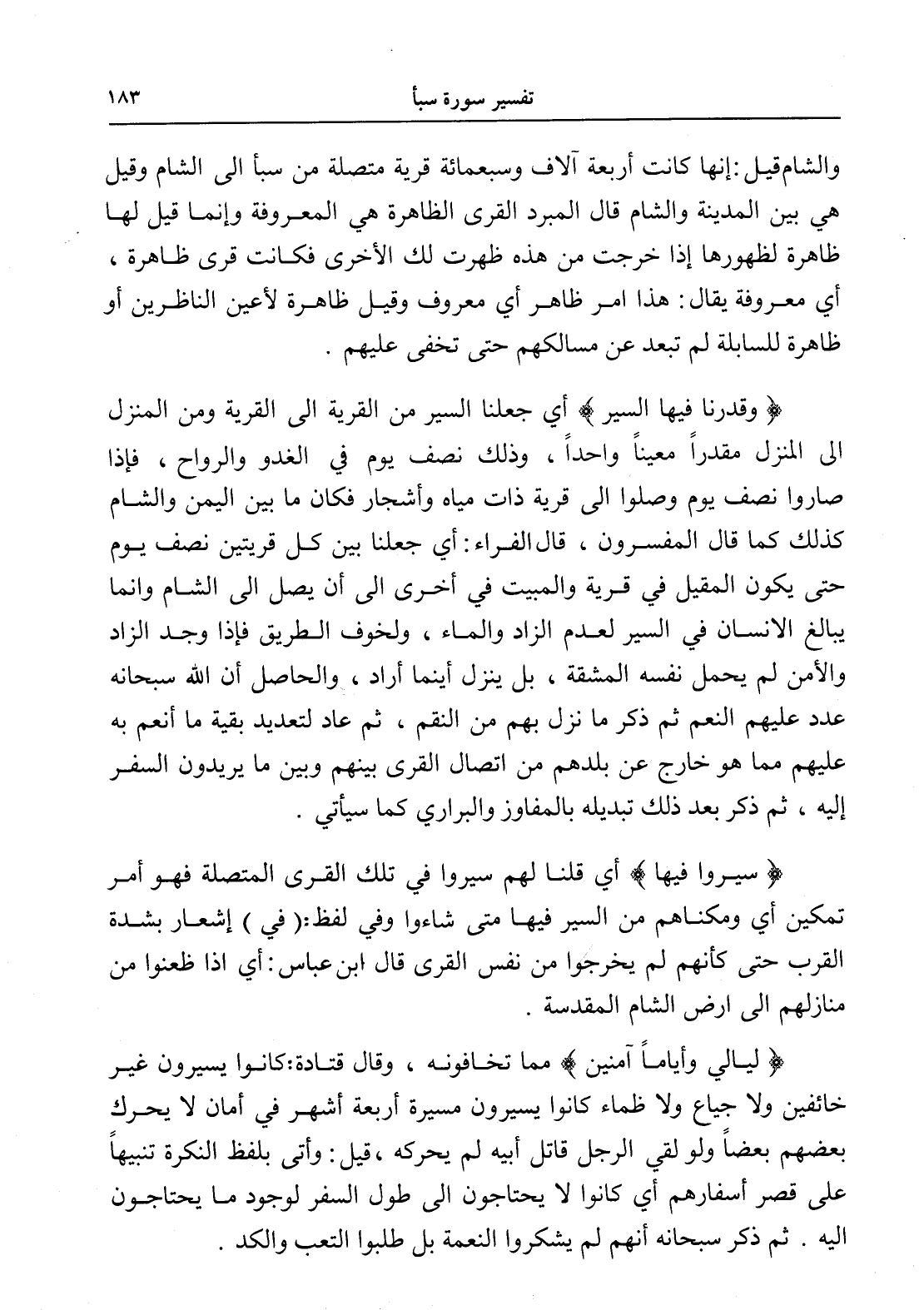 والشام قيل: إنها كانت أربعة آلاف وسبعمائة قرية متصلة من سبأ إلى الشام وقيل هي بين المدينة والشام قال المبرد القرى الظاهرة هي المعروفة وإنما قيل لها ظاهرة لظهورها إذا خرجت من هذه ظهرت لك الأخرى فكانت قرى ظاهرة، أي معروفة يقال: هذا أمر ظاهر أي معروف وقيل ظاهرة لأعين الناظرين أو ظاهرة للسابلة لم تبعد عن مسالكهم حتى تخفى عليهم.