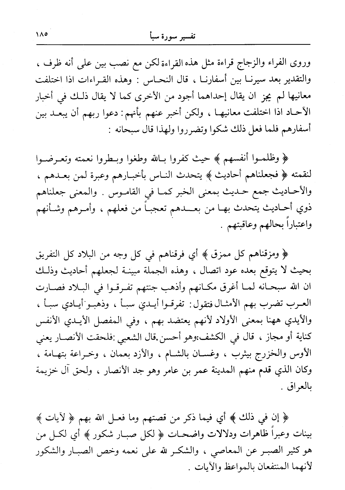 (ومزقناهم كل ممزق) أي فرقناهم في كل وجه من البلاد كل التفريق بحيث لا يتوقع بعده عود اتصال، وهذه الجملة مبينة لجعلهم أحاديث وذلك إن الله سبحانه لما أغرق مكانهم وأذهب جنتهم تفرقوا في البلاد فصارت العرب تضرب بهم الأمثال فتقول: تفرقوا أيدي سبأ، وذهبو أيادي سبأ، والأيدي ههنا بمعنى الأولاد لأنهم يعتضد بهم، وفي المفصل الأيدي الأنفس كناية أو مجاز، قال في الكشف: وهو أحسن. قال الشعبي: فلحقت الأنصار يعني الأوس والخزرج بيثرب، وغسان بالشام، والأزد بعمان، وخراعة بتهامة، وكان الذي قدم منهم المدينة عمر بن عامر وهو جد الأنصار، ولحق آل خزيمة بالعراق.