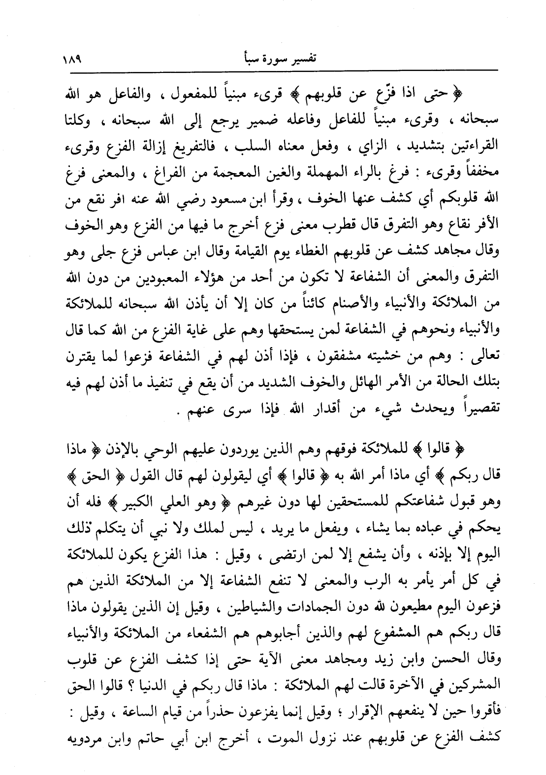 (حتى إذا فزّع عن قلوبهم) قرىء مبنياً للمفعول، والفاعل هو الله سبحانه، وقرىء مبنياً للفاعل وفاعله ضمير يرجع إلى الله سبحانه، وكلتا القراءتين بتشديد، الزاي، وفعل معناه السلب، فالتفريغ إزالة الفزع وقرىء مخففاً وقرىء: فرغ بالراء المهملة والغين المعجمة من الفراغ، والمعنى فرغ الله قلوبكم أي كشف عنها الخوف، وقرأ ابن مسعود رضي الله عنه أفر نقع من الأفر نقاع وهو التفرق قال قطرب معنى فزع أخرج ما فيها من الفزع وهو الخوف وقال مجاهد كشف عن قلوبهم الغطاء يوم القيامة وقال ابن عباس فزع جلى وهو التفرق والمعنى أن الشفاعة لا تكون من أحد من هؤلاء المعبودين من دون الله من الملائكة والأنبياء والأصنام كائناً من كان إلا أن يأذن الله سبحانه للملائكة والأنبياء ونحوهم في الشفاعة لمن يستحقها وهم على غاية الفزع من الله كما قال تعالى: وهم من خشيته مشفقون، فإذا أذن لهم في الشفاعة فزعوا لما يقترن بتلك الحالة من الأمر الهائل والخوف الشديد من أن يقع في تنفيذ ما أذن لهم فيه تقصيراً ويحدث شيء من أقدار الله. فإذا سرى عنهم.