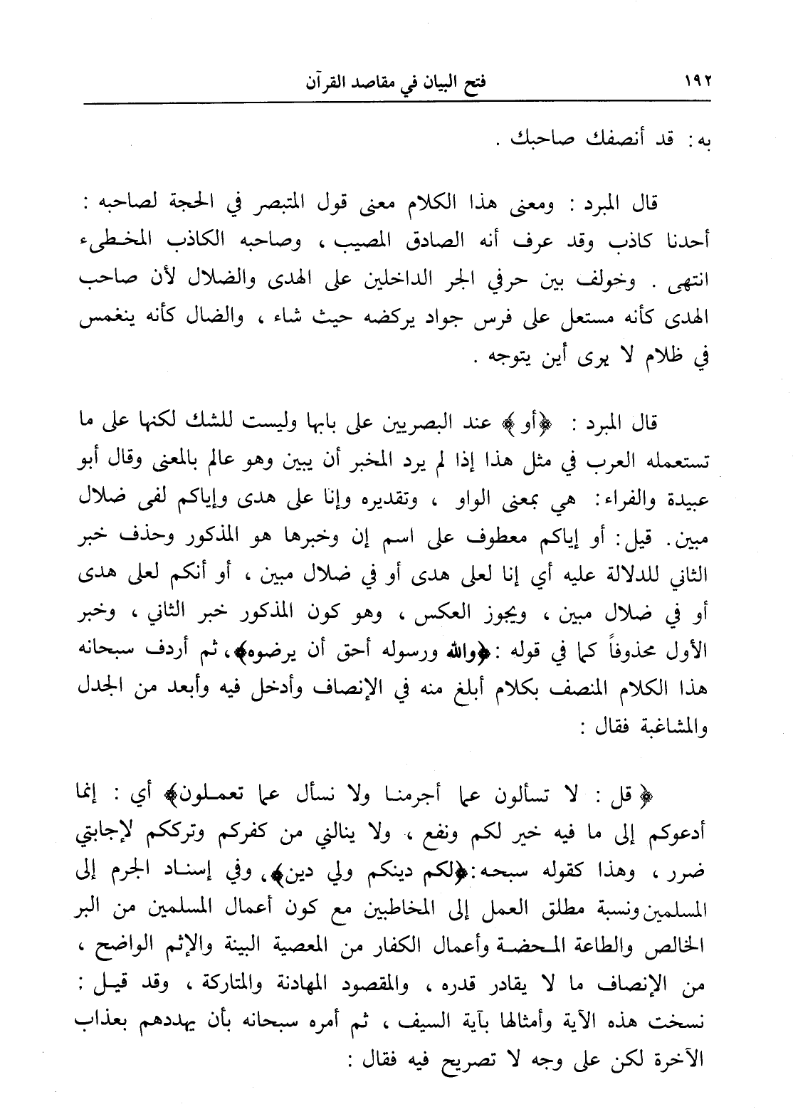 قال المبرد: (أو) عند البصريين على بابها وليست للشك لكنها على ما تستعمله العرب في مثل هذا إذا لم يرد المخبر أن يبين وهو عالم بالمعنى وقال أبو عبيدة والفراء: هي بمعنى الواو، وتقديره وإنا على هدى وإياكم لفي ضلال مبين. قيل: أو إياكم معطوف على اسم إن وخبرها هو المذكور وحذف خبر الثاني للدلالة عليه أي إنا لعلى هدى أو في ضلال مبين، أو أنكم لعلى هدى أو في ضلال مبين، ويجوز العكس، وهو كون المذكور خبر الثاني، وخبر الأول محذوفاً كما في قوله: (والله ورسوله أحق أن يرضوه)، ثم أردف سبحانه هذا الكلام المنصف بكلام أبلغ منه في الإنصاف وأدخل فيه وأبعد من الجدل والمشاغبة فقال:
