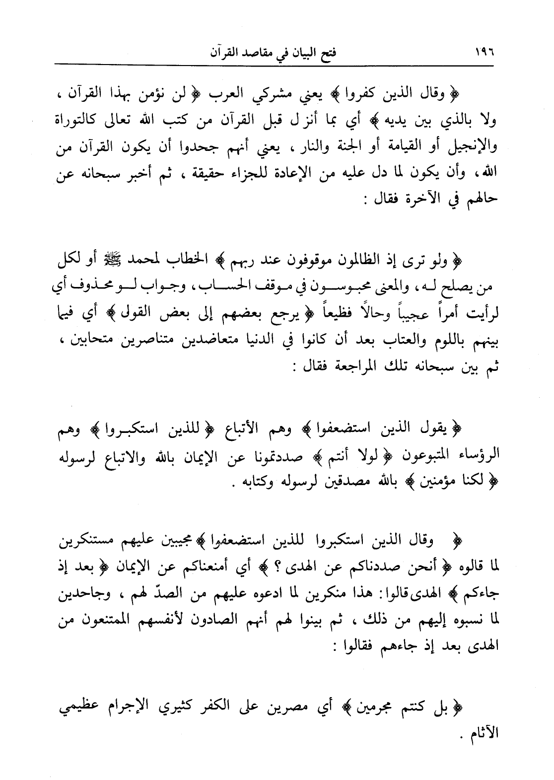 (وقال الذين استكبروا للذين استضعفوا) مجيبين عليهم مستنكرين لما قالوه (أنحن صددناكم عن الهدى)؟ أي أمنعناكم عن الإيمان (بعد إذ جاءكم) الهدى قالوا: هذا منكرين لما ادعوه عليهم من الصدّ لهم، وجاحدين لما نسبوه إليهم من ذلك، ثم بينوا لهم أنهم الصادون لأنفسهم الممتنعون من الهدى بعد إذ جاءهم فقالوا: