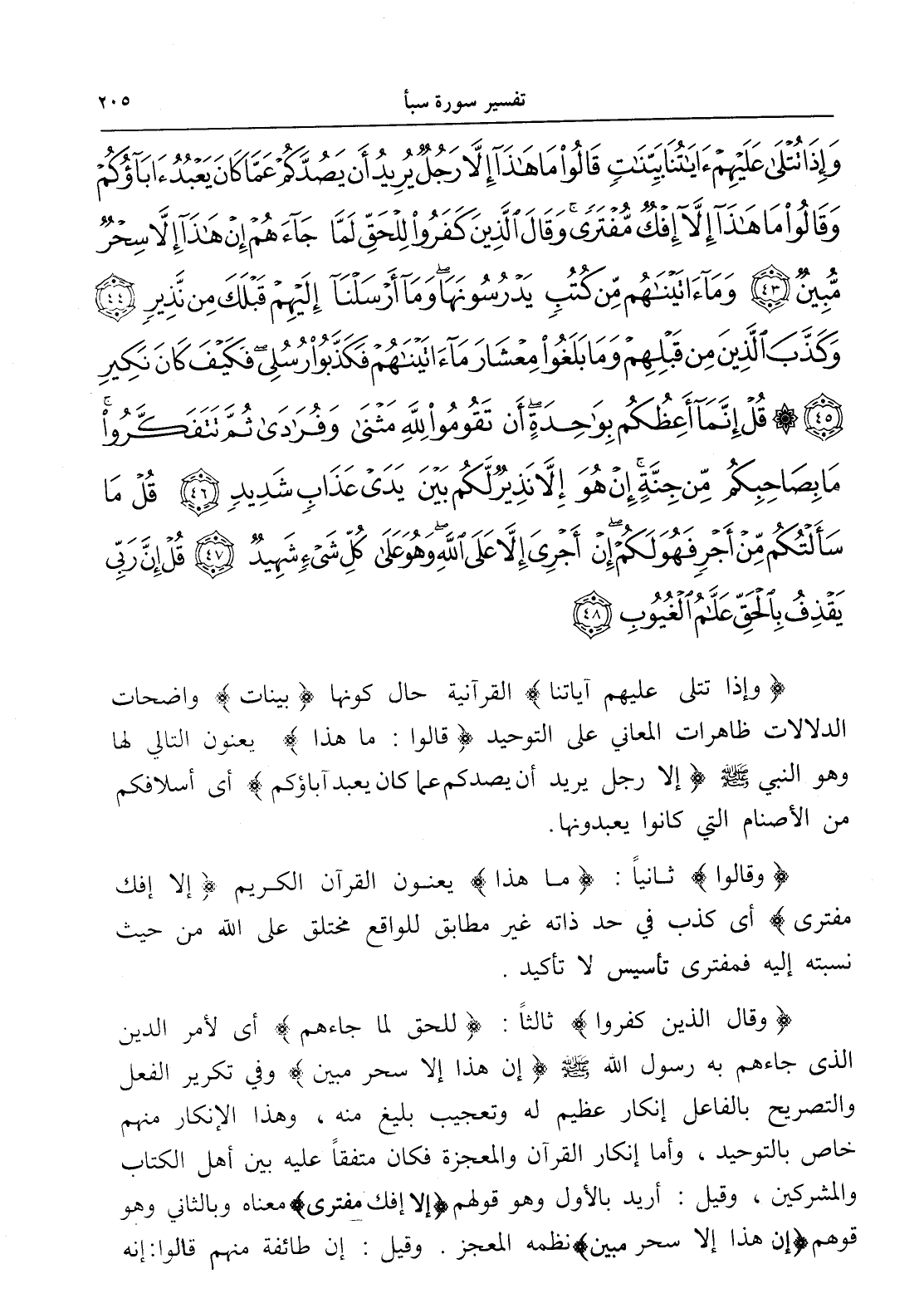 وَإِذَا تُتْلَى عَلَيْهِمْ آيَاتُنَا بَيِّنَاتٍ قَالُوا مَا هَذَا إِلَّا رَجُلٌ يُرِيدُ أَنْ يَصُدَّكُمْ عَمَّا كَانَ يَعْبُدُ آبَاؤُكُمْ وَقَالُوا مَا هَذَا إِلَّا إِفْكٌ مُفْتَرًى وَقَالَ الَّذِينَ كَفَرُوا لِلْحَقِّ لَمَّا جَاءَهُمْ إِنْ هَذَا إِلَّا سِحْرٌ مُبِينٌ (43) وَمَا آتَيْنَاهُمْ مِنْ كُتُبٍ يَدْرُسُونَهَا وَمَا أَرْسَلْنَا إِلَيْهِمْ قَبْلَكَ مِنْ نَذِيرٍ (44) وَكَذَّبَ الَّذِينَ مِنْ قَبْلِهِمْ وَمَا بَلَغُوا مِعْشَارَ مَا آتَيْنَاهُمْ فَكَذَّبُوا رُسُلِي فَكَيْفَ كَانَ نَكِيرِ (45) قُلْ إِنَّمَا أَعِظُكُمْ بِوَاحِدَةٍ أَنْ تَقُومُوا لِلَّهِ مَثْنَى وَفُرَادَى ثُمَّ تَتَفَكَّرُوا مَا بِصَاحِبِكُمْ مِنْ جِنَّةٍ إِنْ هُوَ إِلَّا نَذِيرٌ لَكُمْ بَيْنَ يَدَيْ عَذَابٍ شَدِيدٍ (46) قُلْ مَا سَأَلْتُكُمْ مِنْ أَجْرٍ فَهُوَ لَكُمْ إِنْ أَجْرِيَ إِلَّا عَلَى اللَّهِ وَهُوَ عَلَى كُلِّ شَيْءٍ شَهِيدٌ (47) قُلْ إِنَّ رَبِّي يَقْذِفُ بِالْحَقِّ عَلَّامُ الْغُيُوبِ (48)