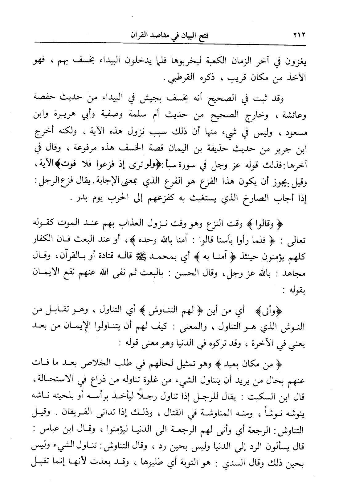 وقد ثبت في الصحيح أنه يخسف بجيش في البيداء من حديث حفصة وعائشة، وخارج الصحيح من حديث أم سلمة وصفية وأبي هريرة وابن مسعود، وليس في شيء منها أن ذلك سبب نزول هذه الآية، ولكنه أخرج ابن جرير من حديث حذيفة بن اليمان قصة الخسف هذه مرفوعة، وقال في آخرها: فذلك قوله عز وجل في سورة سبأ: (ولو ترى إذ فزعوا فلا فوت) الآية، وقيل: يجوز أن يكون هذا الفزع هو الفرع الذي بمعنى الإجابة. يقال فزع الرجل: إذا أجاب الصارخ الذي يستغيث به كفزعهم إلى الحرب يوم بدر.