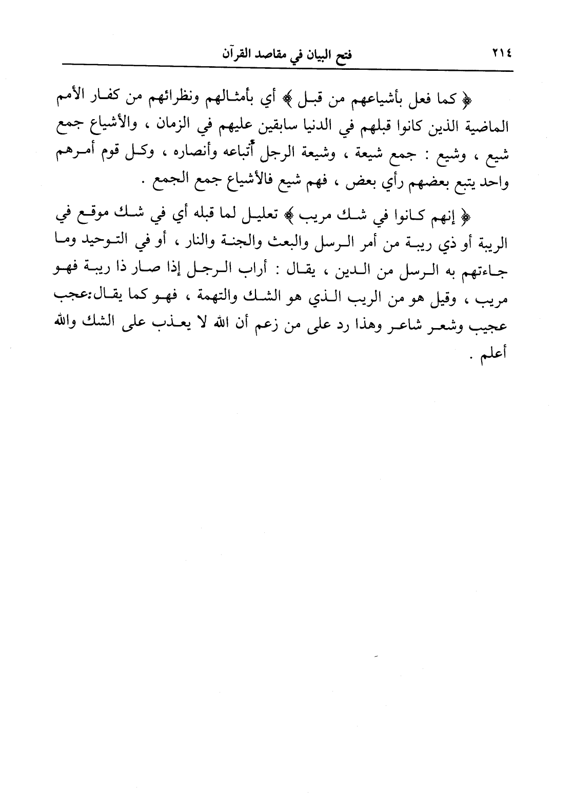 (كما فعل بأشياعهم من قبل) أي بأمثالهم ونظرائهم من كفار الأمم الماضية الذين كانوا قبلهم في الدنيا سابقين عليهم في الزمان، والأشياع جمع شيع، وشيع: جمع شيعة، وشيعة الرجل أتباعه وأنصاره، وكل قوم أمرهم واحد يتبع بعضهم رأي بعض، فهم شيع فالأشياع جمع الجمع.