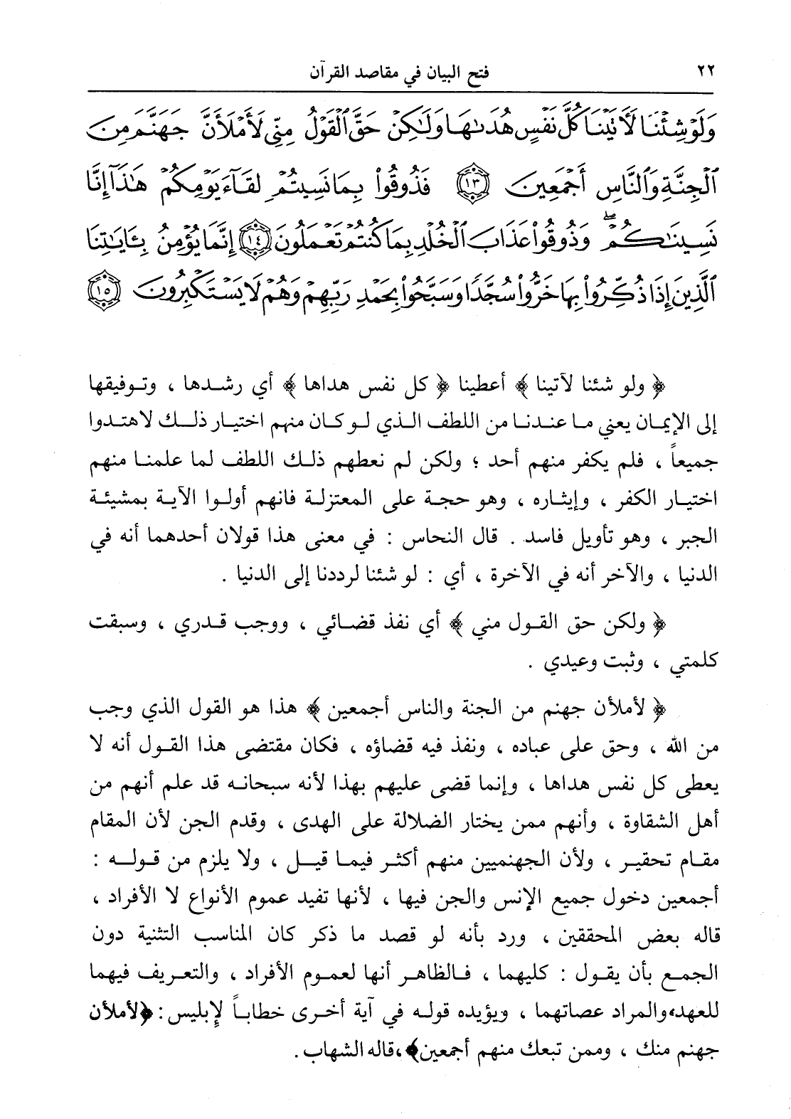 (وَلَوْ شِئْنَا لَآتَيْنَا كُلَّ نَفْسٍ هُدَاهَا وَلَكِنْ حَقَّ الْقَوْلُ مِنِّي لَأَمْلَأَنَّ جَهَنَّمَ مِنَ الْجِنَّةِ وَالنَّاسِ أَجْمَعِينَ (13) فَذُوقُوا بِمَا نَسِيتُمْ لِقَاءَ يَوْمِكُمْ هَذَا إِنَّا نَسِينَاكُمْ وَذُوقُوا عَذَابَ الْخُلْدِ بِمَا كُنْتُمْ تَعْمَلُونَ (14) إِنَّمَا يُؤْمِنُ بِآيَاتِنَا الَّذِينَ إِذَا ذُكِّرُوا بِهَا خَرُّوا سُجَّداً وَسَبَّحُوا بِحَمْدِ رَبِّهِمْ وَهُمْ لَا يَسْتَكْبِرُونَ (15))