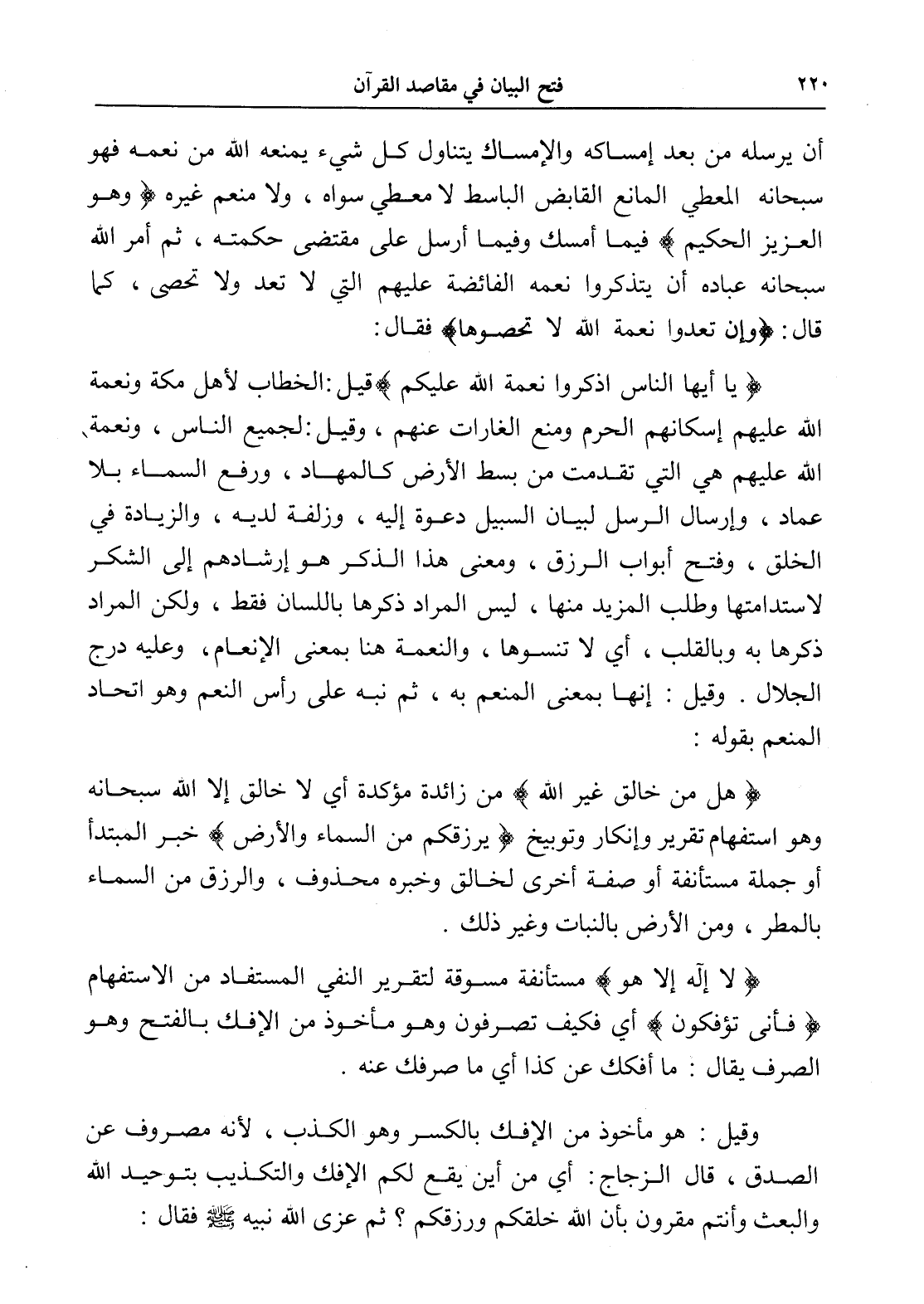 (يا أيها الناس اذكروا نعمة الله عليكم) قيل: الخطاب لأهل مكة ونعمة الله عليهم إسكانهم الحرم ومنع الغارات عنهم، وقيل: لجميع الناس، ونعمة الله عليهم هي التي تقدمت من بسط الأرض كالمهاد، ورفع السماء بلا عماد، وإرسال الرسل لبيان السبيل دعوة إليه، وزلفة لديه، والزيادة في الخلق، وفتح أبواب الرزق، ومعنى هذا الذكر هو إرشادهم إلى الشكر لاستدامتها وطلب المزيد منها، ليس المراد ذكرها باللسان فقط، ولكن المراد ذكرها به وبالقلب، أي لا تنسوها، والنعمة هنا بمعنى الإنعام، وعليه درج الجلال. وقيل: إنها بمعنى النعم به، ثم نبه على رأس النعم وهو اتحاد المنعم بقوله: