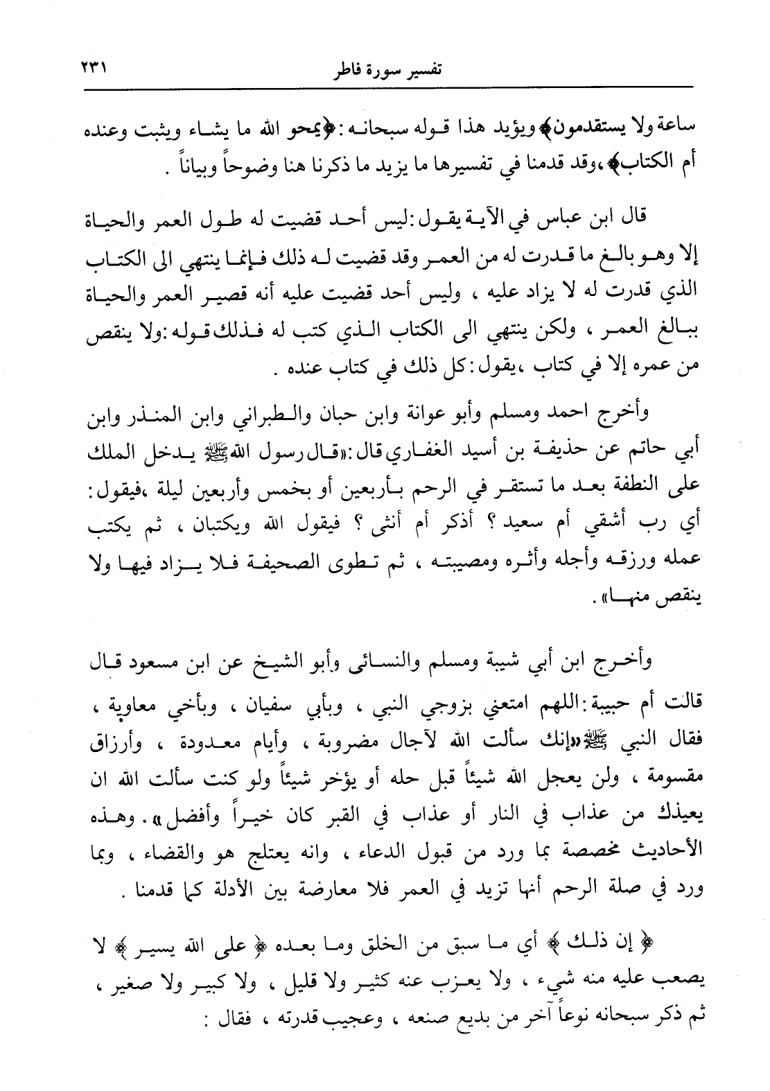 وأخرج ابن أبيِ شيبة ومسلم والنسائي أبو الشيخ عن ابن مسعود قال قالت أم حبيبة: اللهم امتعني بزوجي النبي، وبأبي سفيان، وبأخي معاوية، فقال النبي - صلى الله عليه وسلم - " إنك سألت الله لآجال مضروبة، وأيام معدودة، وأرزاق مقسومة، ولن يعجل الله شيئاًً قبل حله أو يؤخر شيئاًً ولو كنت سألت الله أن يعيذك من عذاب في النار أو عذاب في القبر كان خيراً وأفضل ". وهذه الأحاديث مخصصة بما ورد من قبول الدعاء، وأنه يعتلج هو والقضاء، وبما ورد في صلة الرحم أنها تزيد في العمر فلا معارضة بين الأدلة كما قدمنا.