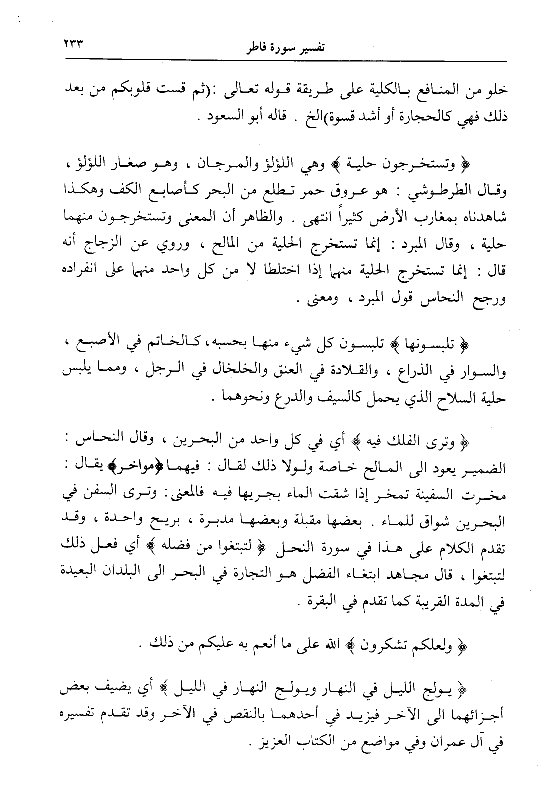 (وترى الفلك فيه) أي في كل واحد من البحرين، وقال النحاس: الضمير يعود إلى المالح خاصة ولولا ذلك لقال: فيهما (مواخر) يقال: مخرت السفينة تمخر إذا شقت الماء بجريها فيه فالمعنى: وترى السفن في البحرين شواق للماء. بعضها مقبلة وبعضها مدبرة، بريح واحدة، وقد تقدم الكلام على هذا في سورة النحل (لتبتغوا من فضله) أي فعل ذلك لتبتغوا، قال مجاهد ابتغاء الفضل هو التجارة في البحر إلى البلدان البعيدة في المدة القريبة كما تقدم في البقرة.