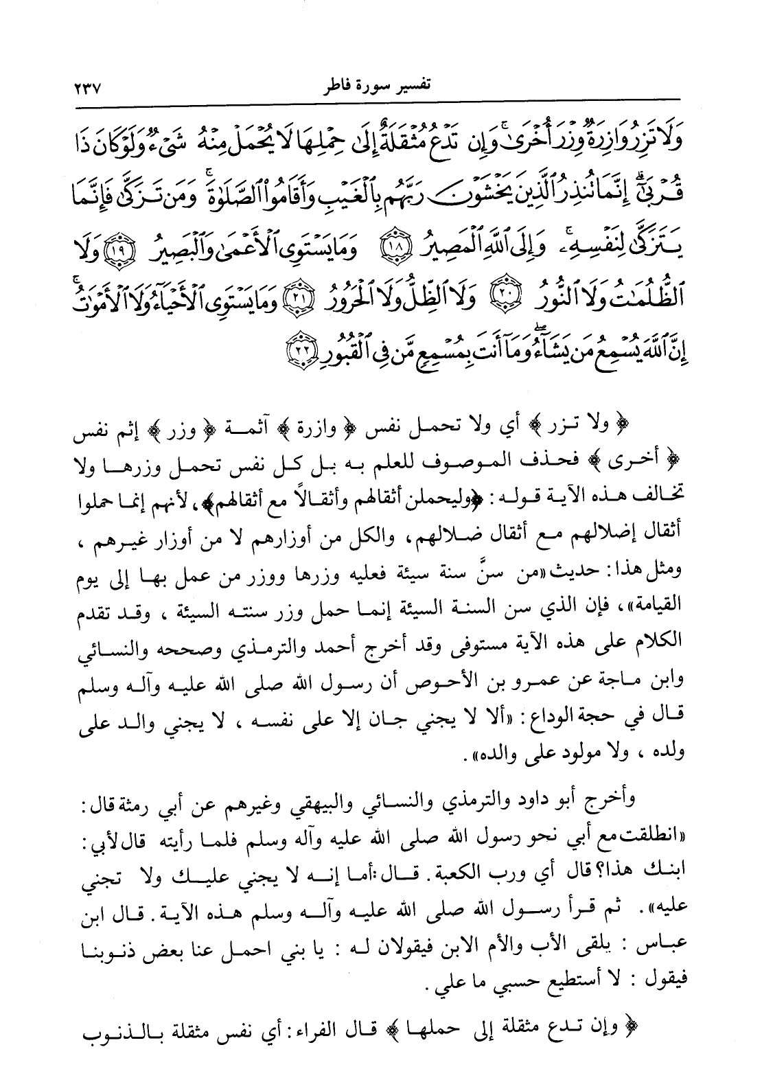وَلَا تَزِرُ وَازِرَةٌ وِزْرَ أُخْرَى وَإِنْ تَدْعُ مُثْقَلَةٌ إِلَى حِمْلِهَا لَا يُحْمَلْ مِنْهُ شَيْءٌ وَلَوْ كَانَ ذَا قُرْبَى إِنَّمَا تُنْذِرُ الَّذِينَ يَخْشَوْنَ رَبَّهُمْ بِالْغَيْبِ وَأَقَامُوا الصَّلَاةَ وَمَنْ تَزَكَّى فَإِنَّمَا يَتَزَكَّى لِنَفْسِهِ وَإِلَى اللَّهِ الْمَصِيرُ (18) وَمَا يَسْتَوِي الْأَعْمَى وَالْبَصِيرُ (19) وَلَا الظُّلُمَاتُ وَلَا النُّورُ (20) وَلَا الظِّلُّ وَلَا الْحَرُورُ (21) وَمَا يَسْتَوِي الْأَحْيَاءُ وَلَا الْأَمْوَاتُ إِنَّ اللَّهَ يُسْمِعُ مَنْ يَشَاءُ وَمَا أَنْتَ بِمُسْمِعٍ مَنْ فِي الْقُبُورِ (22)