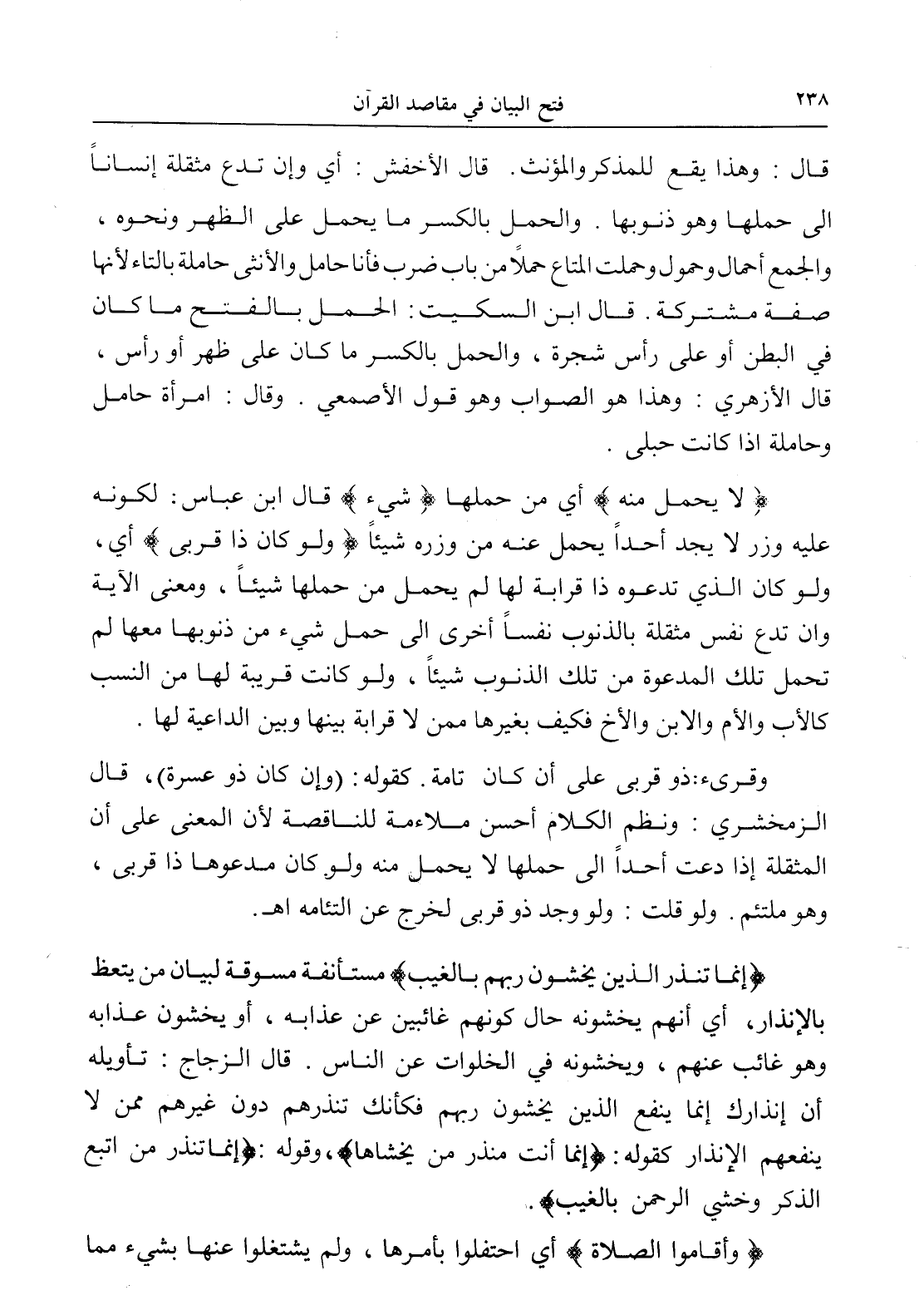 قال: وهذا يقع للمذكر والمؤنث. قال الأخفش: أي وإن تدع مثقلة إنساناً إلى حملها وهو ذنوبها. والحمل بالكسر ما يحمل على الظهر ونحوه، والجمع أحمال وحمول وحملت المتاع حملاً من باب ضرب فأنا حامل والأنثى حاملة بالتاء لأنها صفة مشتركة. قال ابن السكيت: الحمل بالفتح ما كان في البطن أو على رأس شجرة، والحمل بالكسر ما كان على ظهر أو رأس، قال الأزهري: وهذا هو الصواب وهو قول الأصمعي. وقال: امرأة حامل وحاملة إذا كانت حبلى.