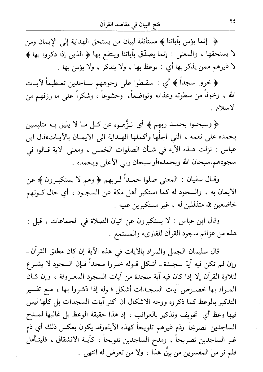 قال سليمان الجمل والمراد بالآيات في هذه الآية إن كان مطلق القرآن - وإن لم تكن فيه آية سجدة- أشكل قوله خروا سجداً فإن السجود لا يشرع لتلاوة القرآن إلا إذا كان فيه آية سجدة من آيات السجود المعروفة، وإن كان المراد بها خصوص آيات السجدات أشكل قوله إذا ذكروا بها، مع تفسير التذكير بالوعظ كما ذكروه ووجه الاشكال أن أكثر آيات السجدات بل كلها ليس فيها وعظ أي تخويف وتذكير بالعواقب، إذ هذا حقيقة الوعظ بل غالبها لمدح الساجدين تصريحاً وذم غيرهم تلويحاً كهذه الآية، وقد يكون بعكس ذلك أي ذم غير الساجدين تصريحاً، ومدح الساجدين تلويحاً، كآية الانشقاق، فليتأمل فلم نر من المفسرين من بيَّن هذا، ولا من تعرض له انتهى.