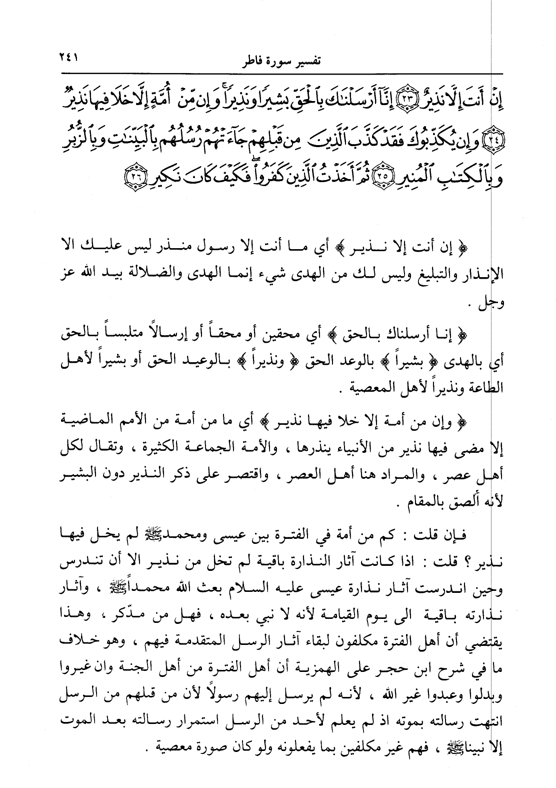 إِنْ أَنْتَ إِلَّا نَذِيرٌ (23) إِنَّا أَرْسَلْنَاكَ بِالْحَقِّ بَشِيرًا وَنَذِيرًا وَإِنْ مِنْ أُمَّةٍ إِلَّا خَلَا فِيهَا نَذِيرٌ (24) وَإِنْ يُكَذِّبُوكَ فَقَدْ كَذَّبَ الَّذِينَ مِنْ قَبْلِهِمْ جَاءَتْهُمْ رُسُلُهُمْ بِالْبَيِّنَاتِ وَبِالزُّبُرِ وَبِالْكِتَابِ الْمُنِيرِ (25) ثُمَّ أَخَذْتُ الَّذِينَ كَفَرُوا فَكَيْفَ كَانَ نَكِيرِ (26)