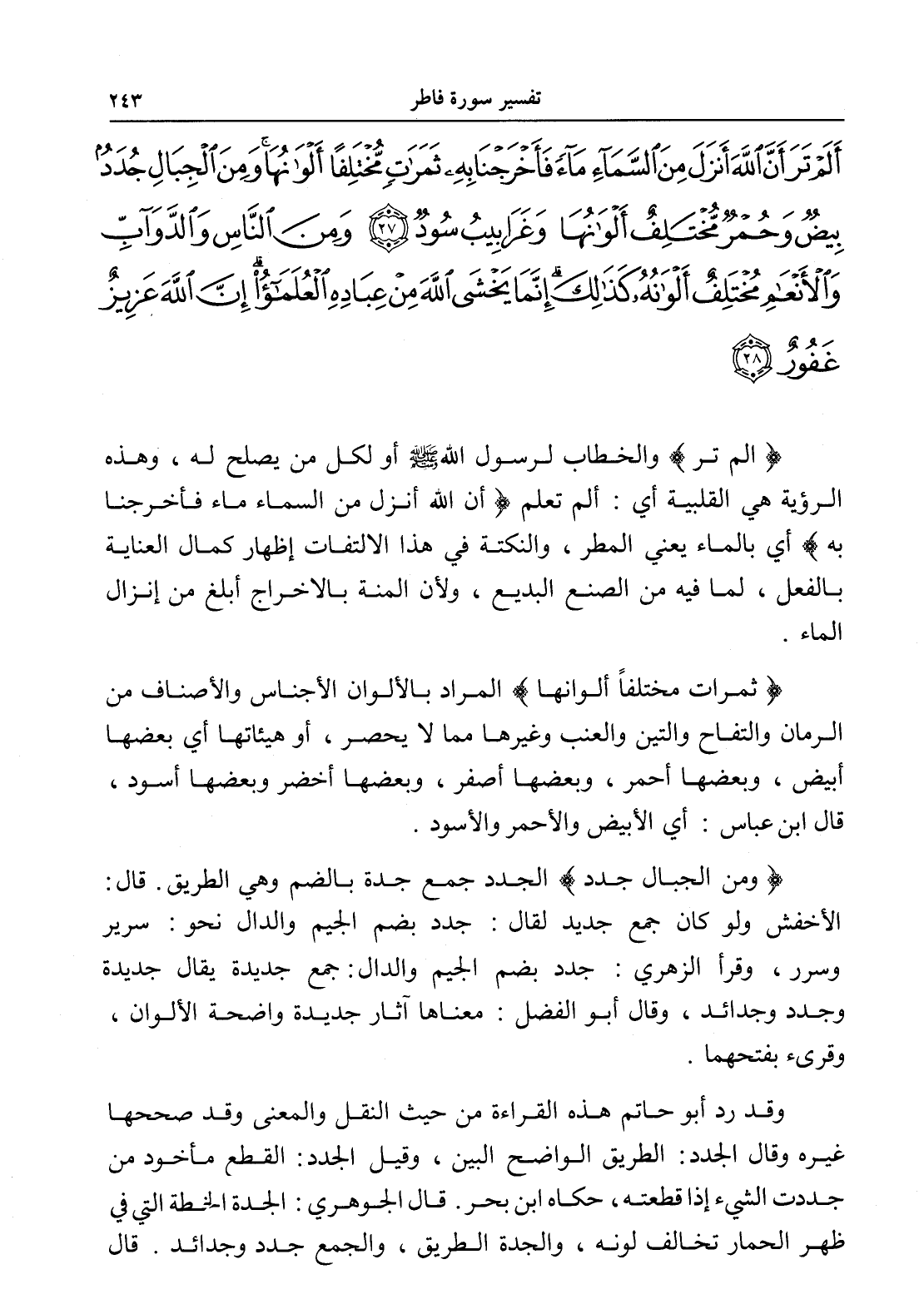أَلَمْ تَرَ أَنَّ اللَّهَ أَنْزَلَ مِنَ السَّمَاءِ مَاءً فَأَخْرَجْنَا بِهِ ثَمَرَاتٍ مُخْتَلِفًا أَلْوَانُهَا وَمِنَ الْجِبَالِ جُدَدٌ بِيضٌ وَحُمْرٌ مُخْتَلِفٌ أَلْوَانُهَا وَغَرَابِيبُ سُودٌ (27) وَمِنَ النَّاسِ وَالدَّوَابِّ وَالْأَنْعَامِ مُخْتَلِفٌ أَلْوَانُهُ كَذَلِكَ إِنَّمَا يَخْشَى اللَّهَ مِنْ عِبَادِهِ الْعُلَمَاءُ إِنَّ اللَّهَ عَزِيزٌ غَفُورٌ (28)