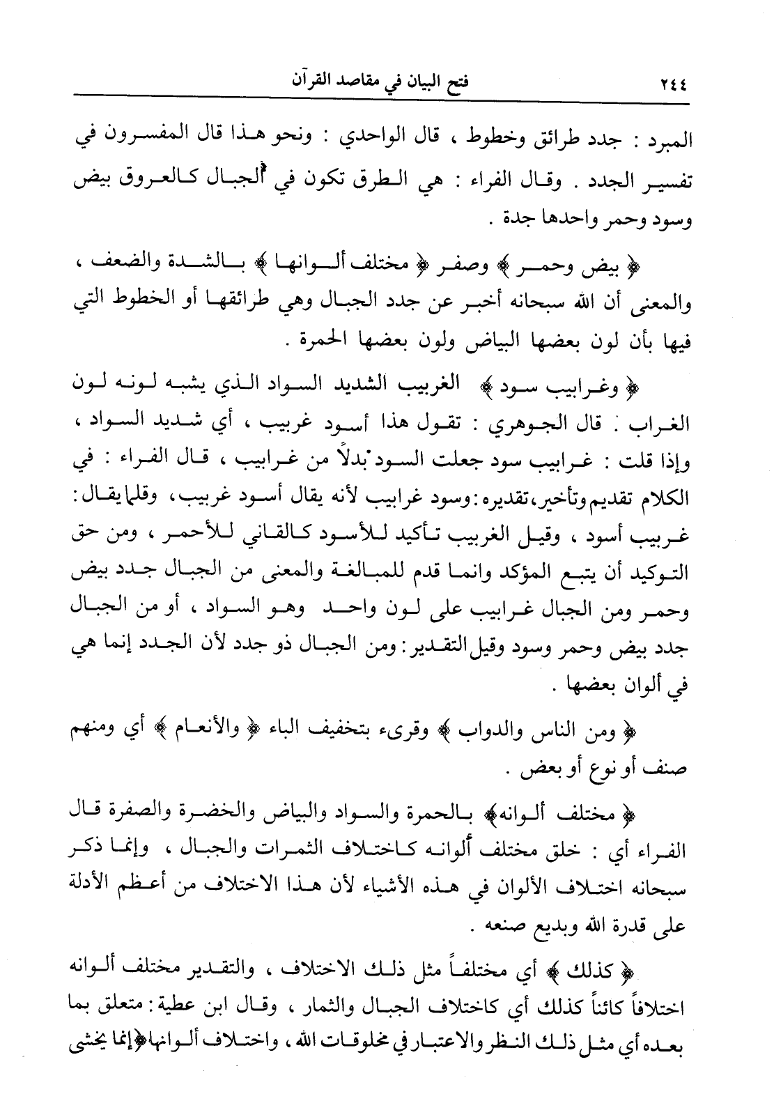 (بيض وحمر) وصفر (مختلف ألوانها) بالشدة والضعف، والمعنى أن الله سبحانه أخبر عن جدد الجبال وهي طرائقها أو الخطوط التي فيها بأن لون بعضها البياض ولون بعضها الحمرة.