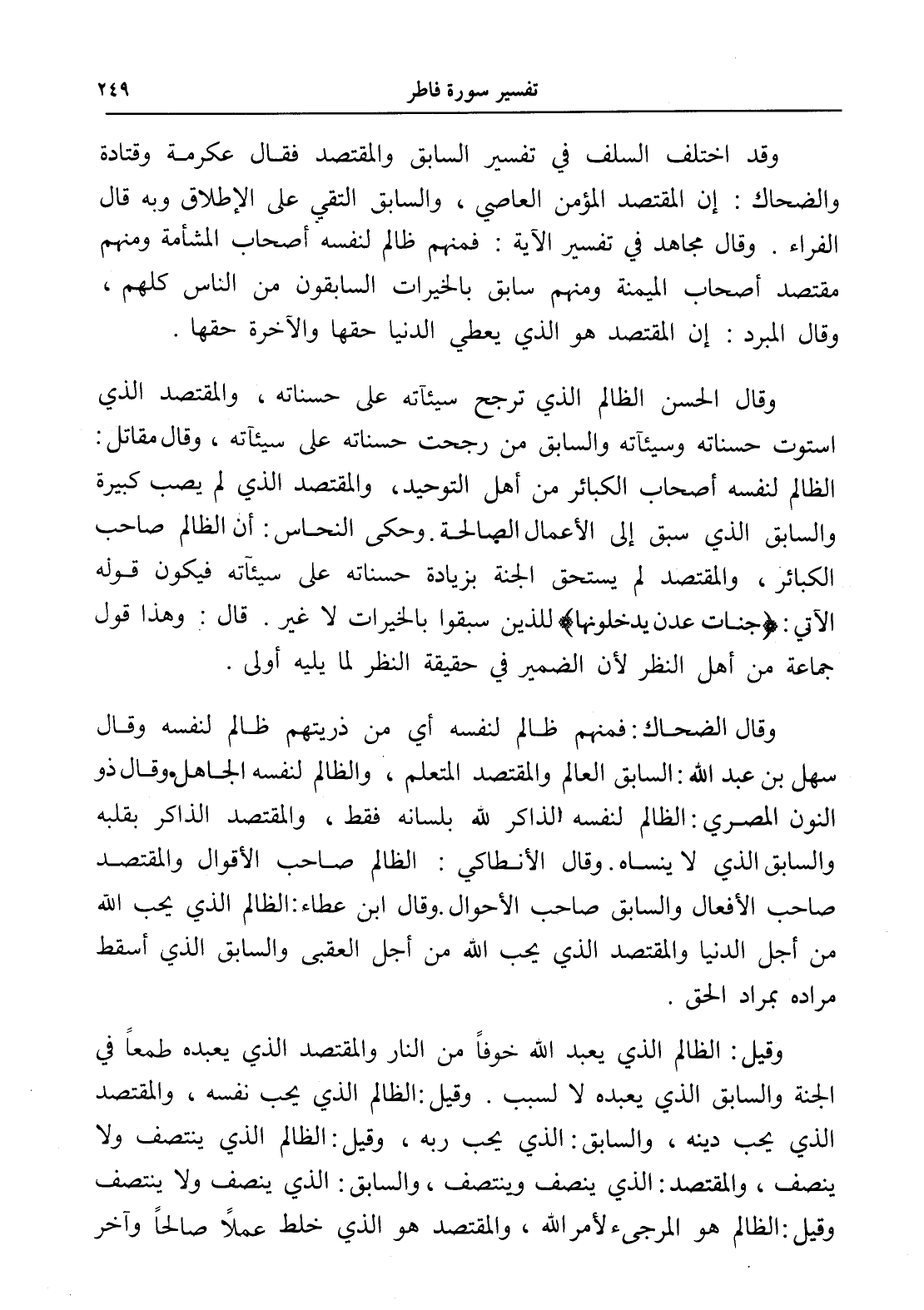 وقيل: الظالم الذي يعبد الله خوفاً من النار والمقتصد الذي يعبده طمعاً في الجنة والسابق الذي يعبده لا لسبب. وقيل: الظالم الذي يحب نفسه، والمقتصد الذي يحب دينه، والسابق: الذي يحب ربه، وقيل: الظالم الذي ينتصف ولا ينصف، والمقتصد: الذي ينصف وينتصف، والسابق: الذي ينصف ولا ينتصف وقيل: الظالم هو المرجىء لأمر الله، والمقتصد هو الذي خلط عملاً صالحاً وآخر