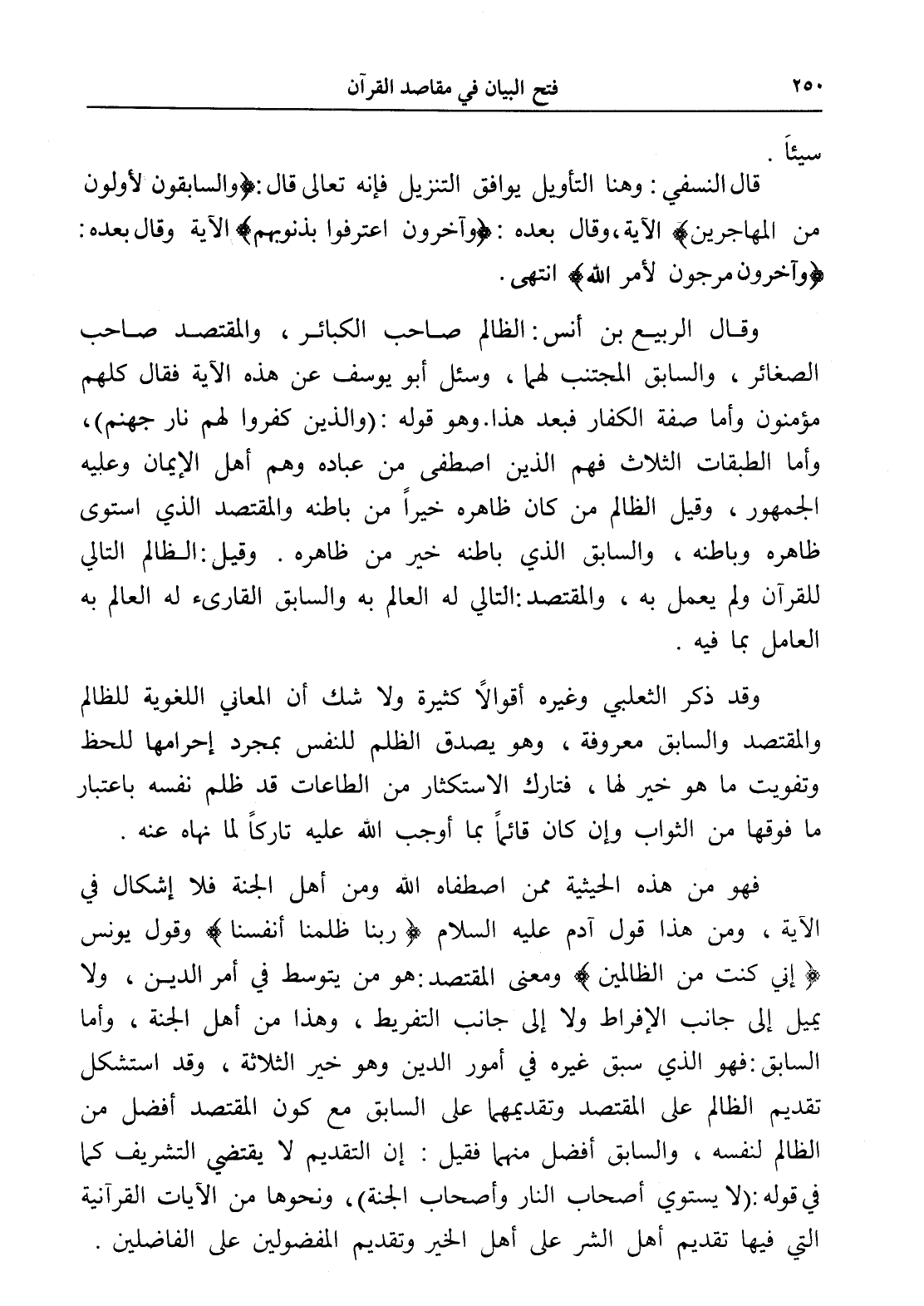 فهو من هذه الحيثية ممن اصطفاه الله ومن أهل الجنة فلا إشكال في الآية، ومن هذا قول آدم عليه السلام (ربنا ظلمنا أنفسنا) وقول يونس (إني كنت من الظالمين) ومعنى المقتصد: هو من يتوسط في أمر الدين، ولا يميل إلى جانب الإفراط ولا إلى جانب التفريط، وهذا من أهل الجنة، وأما السابق: فهو الذي سبق غيره في أمور الدين وهو خير الثلاثة، وقد استشكل تقديم الظالم على المقتصد وتقديمهما على السابق مع كون المقتصد أفضل من الظالم لنفسه، والسابق أفضل منهما فقيل: إن التقديم لا يقتضي التشريف كما في قوله: (لا يستوي أصحاب النار وأصحاب الجنة)، ونحوها من الآيات القرآنية التي فيها تقديم أهل الشر على أهل الخير وتقديم المفضولين على الفاضلين.