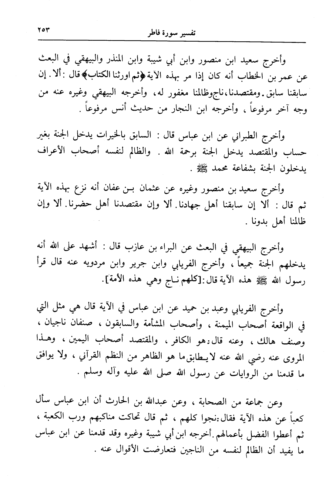 وأخرج سعيد ابن منصور وابن أبي شيبة وابن المنذر والبيهقي في البعث عن عمر بن الخطاب أنه كان إذا مر بهذه الآية (ثم أورثنا الكتاب) قال: ألا. إن سابقنا سابق. ومقتصدنا، ناج وظالمنا مغفور له، وأخرجه البيهقي وغيره عنه من وجه آخر مرفوعاً، وأخرجه ابن النجار من حديث أنس مرفوعاً.