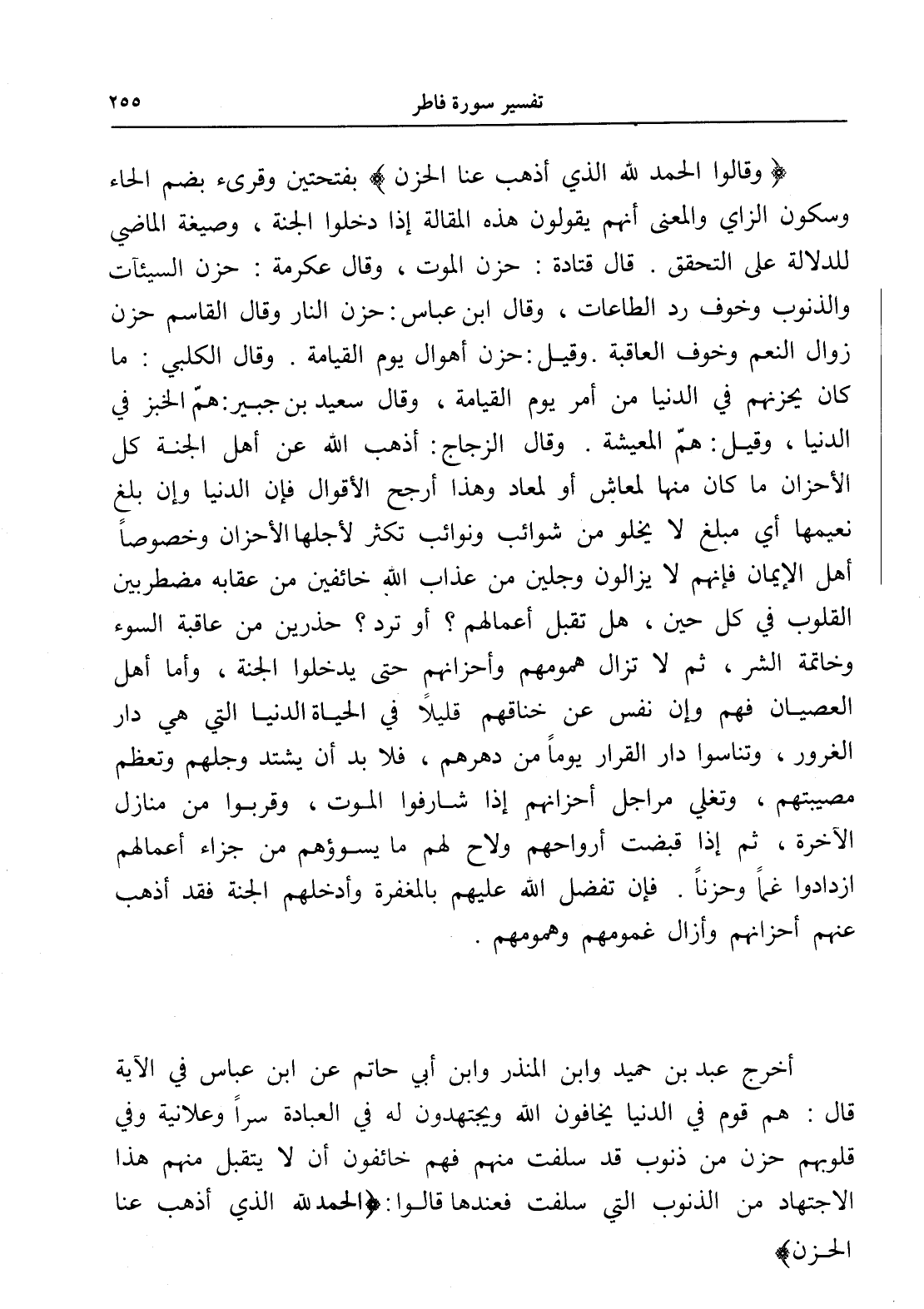 أخرج عبد بن حميد وابن المنذر وابن أبي حاتم عن ابن عباس في الآية قال: هم قوم في الدنيا يخافون الله ويجتهدون له في العبادة سراً وعلانية وفي قلوبهم حزن من ذنوب قد سلفت منهم فهم خائفون أن لا يتقبل منهم هذا الاجتهاد من الذنوب التي سلفت فعندها قالوا: (الحمد لله الذي أذهب عنا الحزن).