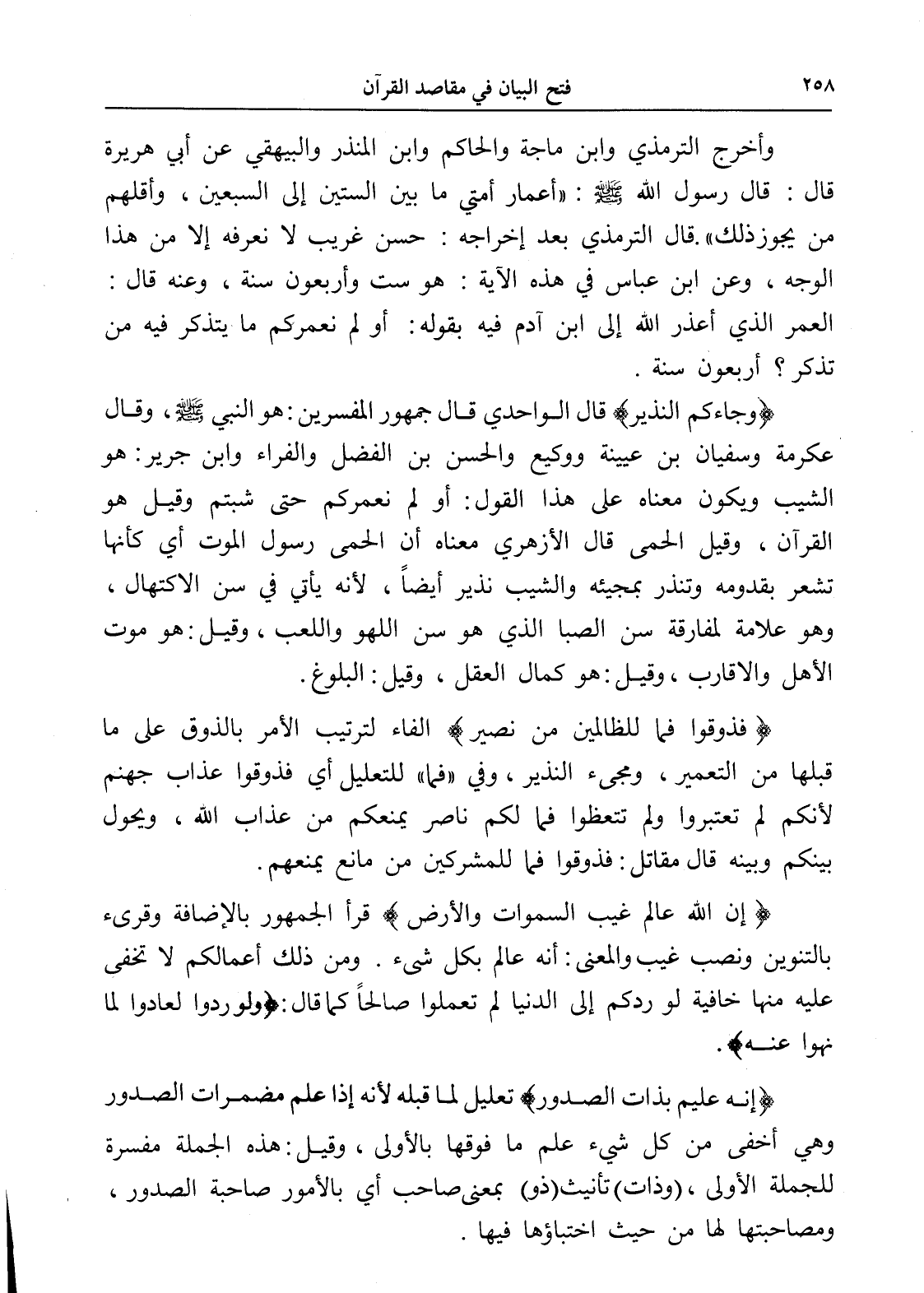 وأخرج الترمذي وابن ماجة والحاكم وابن المنذر والبيهقي عن أبي هريرة قال: قال رسول الله - صلى الله عليه وسلم -: " أعمار أمتي ما بين الستين إلى السبعين، وأقلهم من يجوز ذلك ". قال الترمذي بعد إخراجه: حسن غريب لا نعرفه إلا من هذا الوجه، وعن ابن عباس في هذه الآية: هو ست وأربعون سنة، وعنه قال: العمر الذي أعذر الله إلى ابن آدم فيه بقوله: أولم نعمركم ما يتذكر فيه من تذكر؟ أربعون سنة.