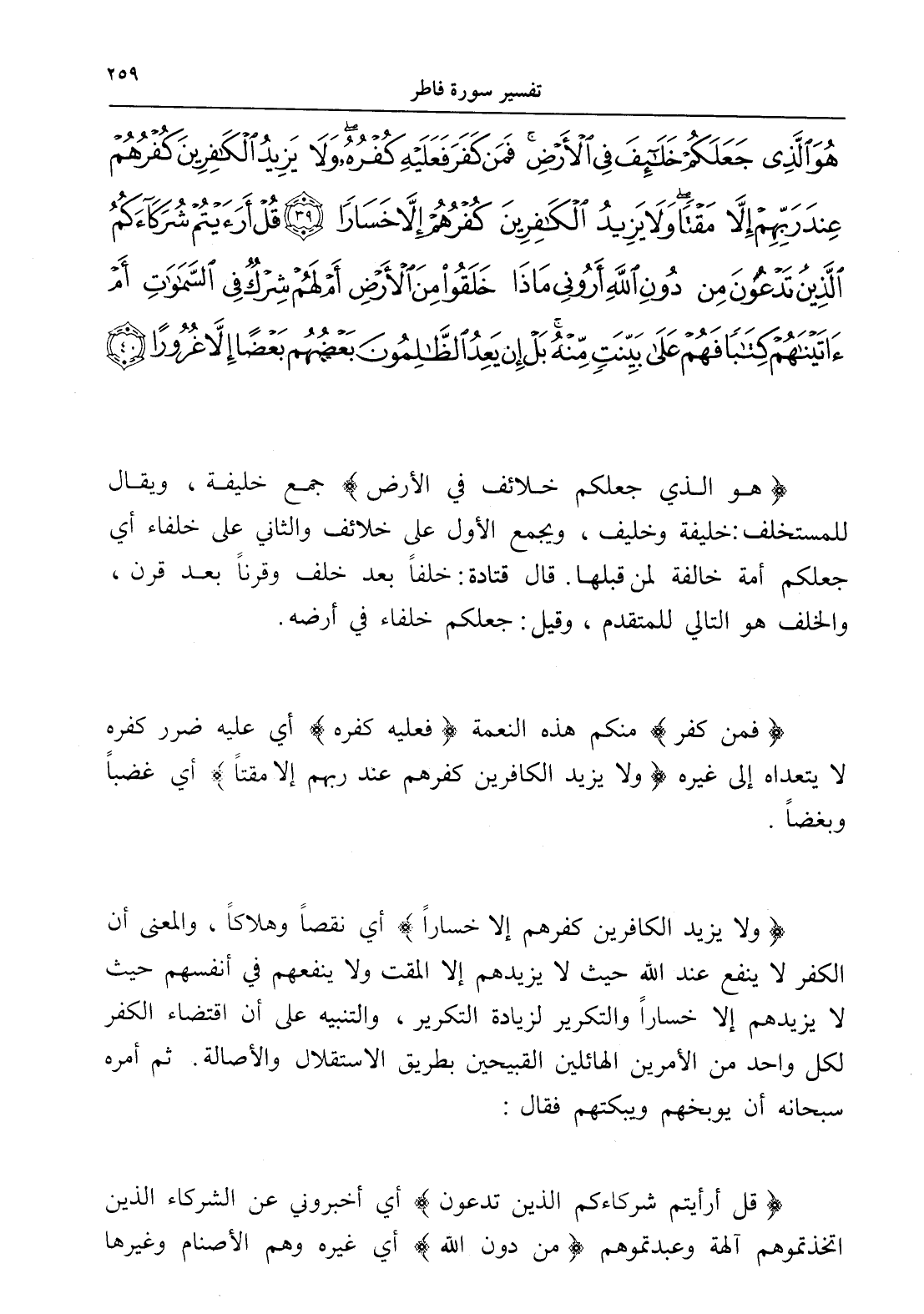 هُوَ الَّذِي جَعَلَكُمْ خَلَائِفَ فِي الْأَرْضِ فَمَنْ كَفَرَ فَعَلَيْهِ كُفْرُهُ وَلَا يَزِيدُ الْكَافِرِينَ كُفْرُهُمْ عِنْدَ رَبِّهِمْ إِلَّا مَقْتًا وَلَا يَزِيدُ الْكَافِرِينَ كُفْرُهُمْ إِلَّا خَسَارًا (39) قُلْ أَرَأَيْتُمْ شُرَكَاءَكُمُ الَّذِينَ تَدْعُونَ مِنْ دُونِ اللَّهِ أَرُونِي مَاذَا خَلَقُوا مِنَ الْأَرْضِ أَمْ لَهُمْ شِرْكٌ فِي السَّمَاوَاتِ أَمْ آتَيْنَاهُمْ كِتَابًا فَهُمْ عَلَى بَيِّنَتٍ مِنْهُ بَلْ إِنْ يَعِدُ الظَّالِمُونَ بَعْضُهُمْ بَعْضًا إِلَّا غُرُورًا (40)