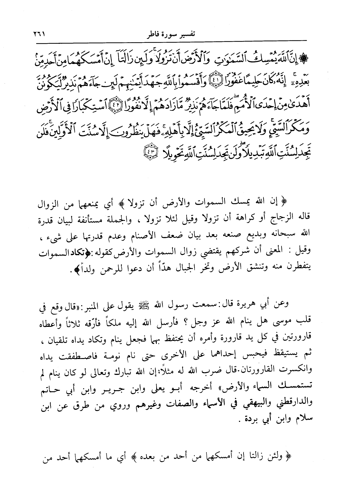 إِنَّ اللَّهَ يُمْسِكُ السَّمَاوَاتِ وَالْأَرْضَ أَنْ تَزُولَا وَلَئِنْ زَالَتَا إِنْ أَمْسَكَهُمَا مِنْ أَحَدٍ مِنْ بَعْدِهِ إِنَّهُ كَانَ حَلِيمًا غَفُورًا (41) وَأَقْسَمُوا بِاللَّهِ جَهْدَ أَيْمَانِهِمْ لَئِنْ جَاءَهُمْ نَذِيرٌ لَيَكُونُنَّ أَهْدَى مِنْ إِحْدَى الْأُمَمِ فَلَمَّا جَاءَهُمْ نَذِيرٌ مَا زَادَهُمْ إِلَّا نُفُورًا (42) اسْتِكْبَارًا فِي الْأَرْضِ وَمَكْرَ السَّيِّئِ وَلَا يَحِيقُ الْمَكْرُ السَّيِّئُ إِلَّا بِأَهْلِهِ فَهَلْ يَنْظُرُونَ إِلَّا سُنَّتَ الْأَوَّلِينَ فَلَنْ تَجِدَ لِسُنَّتِ اللَّهِ تَبْدِيلًا وَلَنْ تَجِدَ لِسُنَّتِ اللَّهِ تَحْوِيلًا (43)