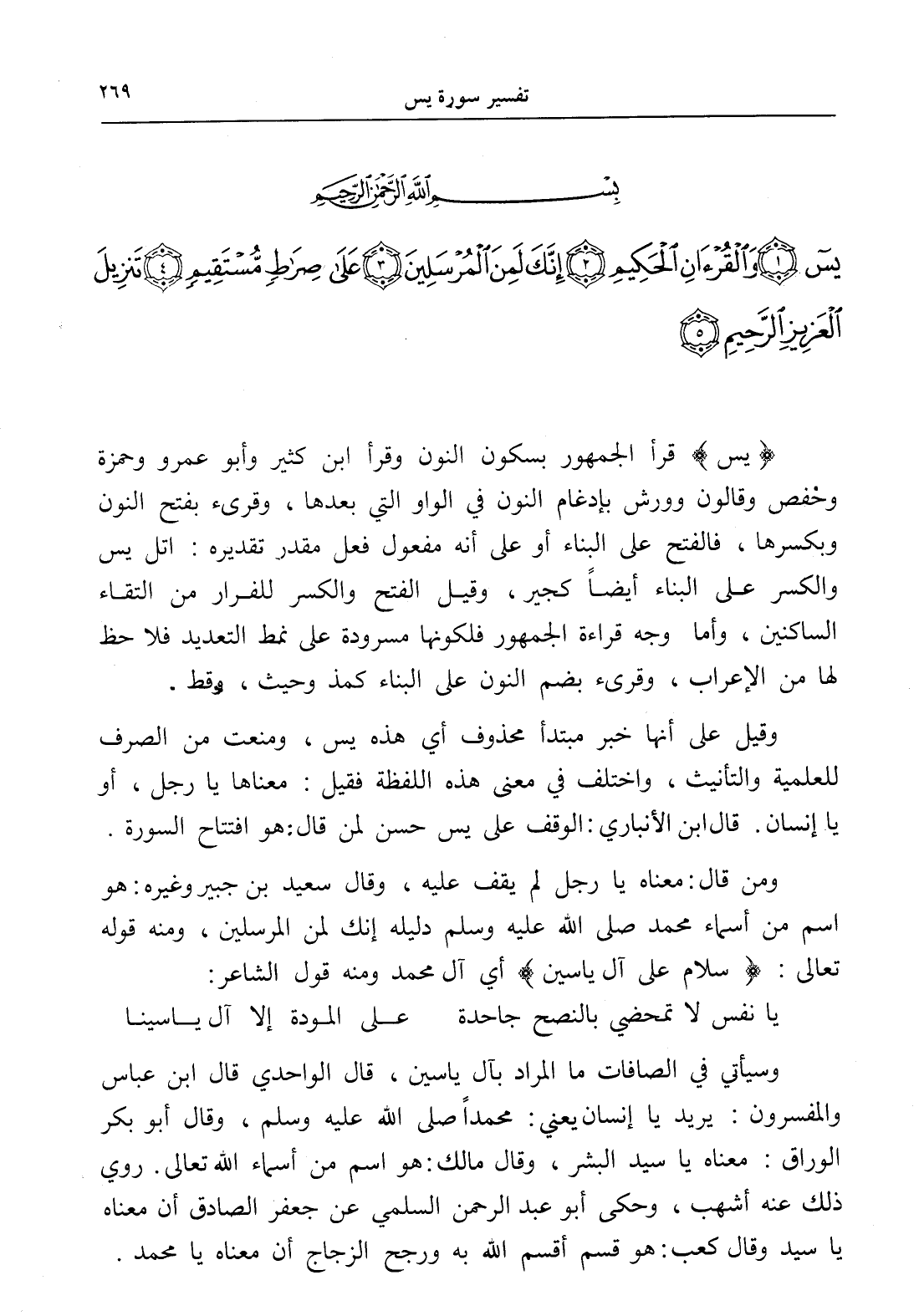 ومن قال: معناه يا رجل لم يقف عليه، وقال سعيد بن جبير وغيره: هو اسم من أسماء محمد صلى الله عليه وسلم دليله إنك لمن المرسلين، ومنه قوله تعالى: (سلام على آل ياسين) أي آل محمد ومنه قول الشاعر: