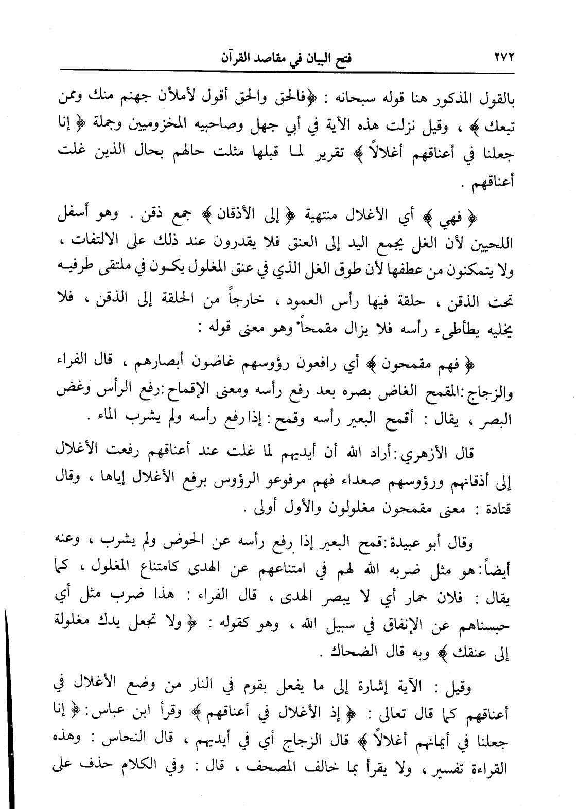 (فهي) أي الأغلال منتهية (إلى الأذقان) جمع ذقن. وهو أسفل اللحيين لأن الغل يجمع اليد إلى العنق فلا يقدرون عند ذلك على الالتفات، ولا يتمكنون من عطفها لأن طوق الغل الذي في عنق المغلول يكون في ملتقى طرفيه تحت الذقن، حلقة فيها رأس العمود، خارجاً من الحلقة إلى الذقن، فلا يخليه يطأطىء رأسه فلا يزال مقمحاً وهو معنى قوله: