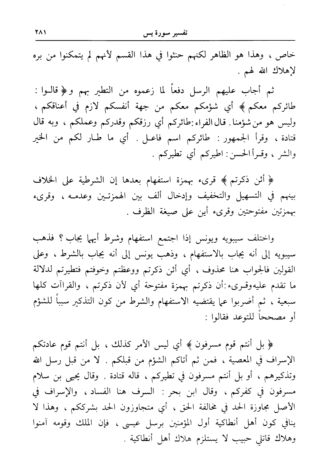 (بل أنتم قوم مسرفون) أي ليس الأمر كذلك، بل أنتم قوم عادتكم الإسراف في المعصية، فمن ثم أتاكم الشؤم من قبلكم. لا من قبل رسل الله وتذكيرهم، أو بل أنتم مسرفون في تطيركم، قاله قتادة. وقال يحيى بن سلام مسرفون في كفركم، وقال ابن بحر: السرف هنا الفساد، والإسراف في الأصل مجاوزة الحد في مخالفة الحق، أي متجاوزون الحد بشرككم، وهذا لا ينافي كون أهل أنطاكية أول المؤمنين برسل عيسى، فإن الملك وقومه آمنوا وهلاك قاتلي حبيب لا يستلزم هلاك أهل أنطاكية.