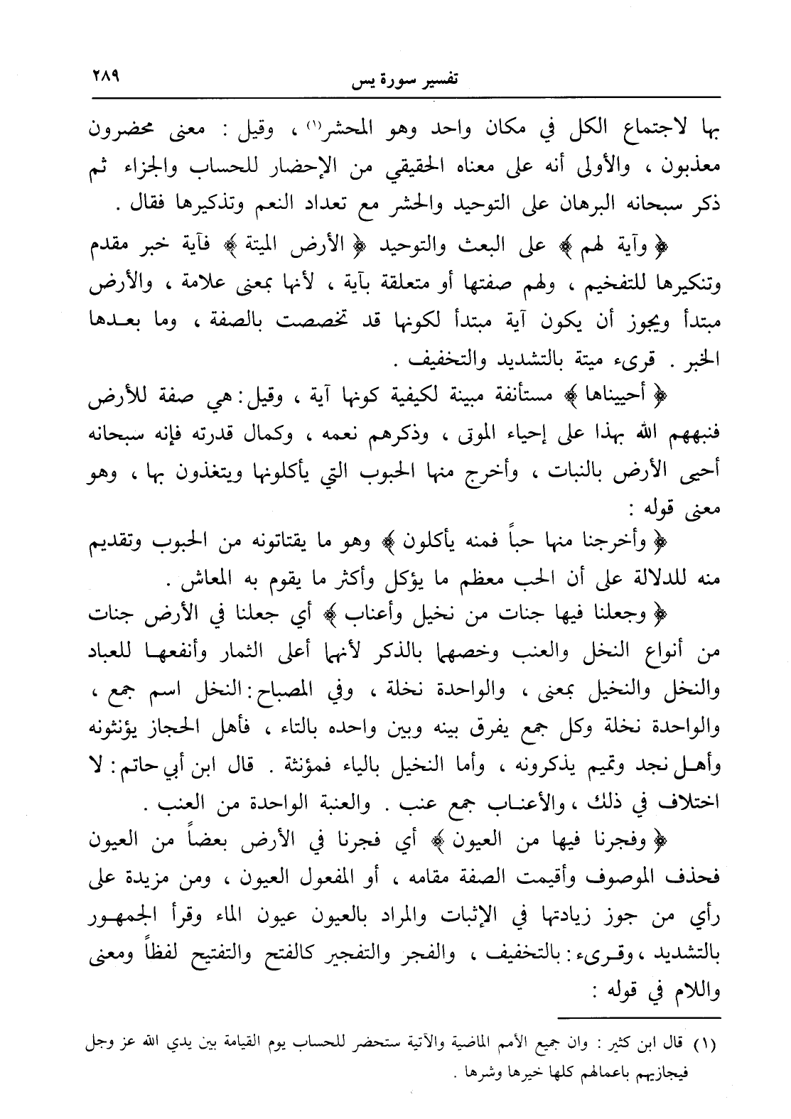 (وآية لهم) على البعث والتوحيد (الأرض الميتة) فآية خبر مقدم وتنكيرها للتفخيم، ولهم صفتها أو متعلقة بآية، لأنها بمعنى علامة، والأرض مبتدأ ويجوز أن يكون آية مبتدأ لكونها قد تخصصت بالصفة، وما بعدها الخبر. قرىء ميتة بالتشديد والتخفيف.