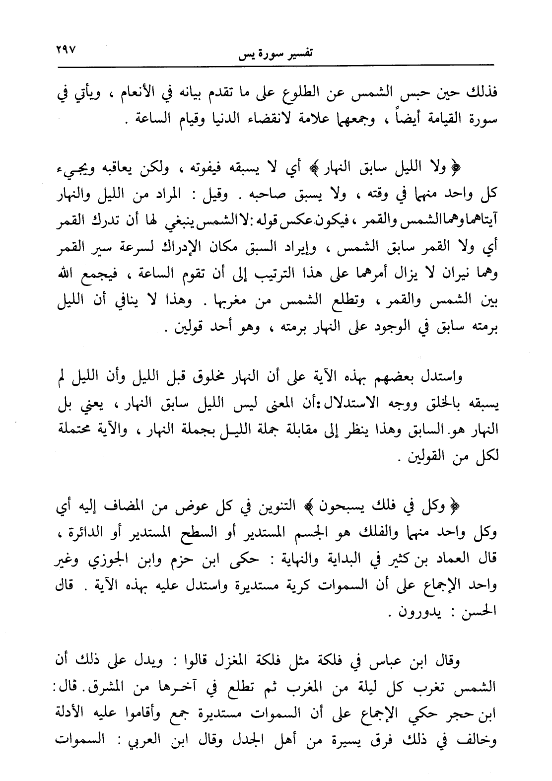 وقال ابن عباس في فلكة مثل فلكة المغزل قالوا: ويدل على ذلك أن الشمس تغرب كل ليلة من المغرب ثم تطلع في آخرها من الشرق. قال: ابن حجر حكى الإجماع على أن السموات مستديرة جمع وأقاموا عليه الأدلة وخالف في ذلك فرق يسيرة من أهل الجدل وقال ابن العربي: السموات