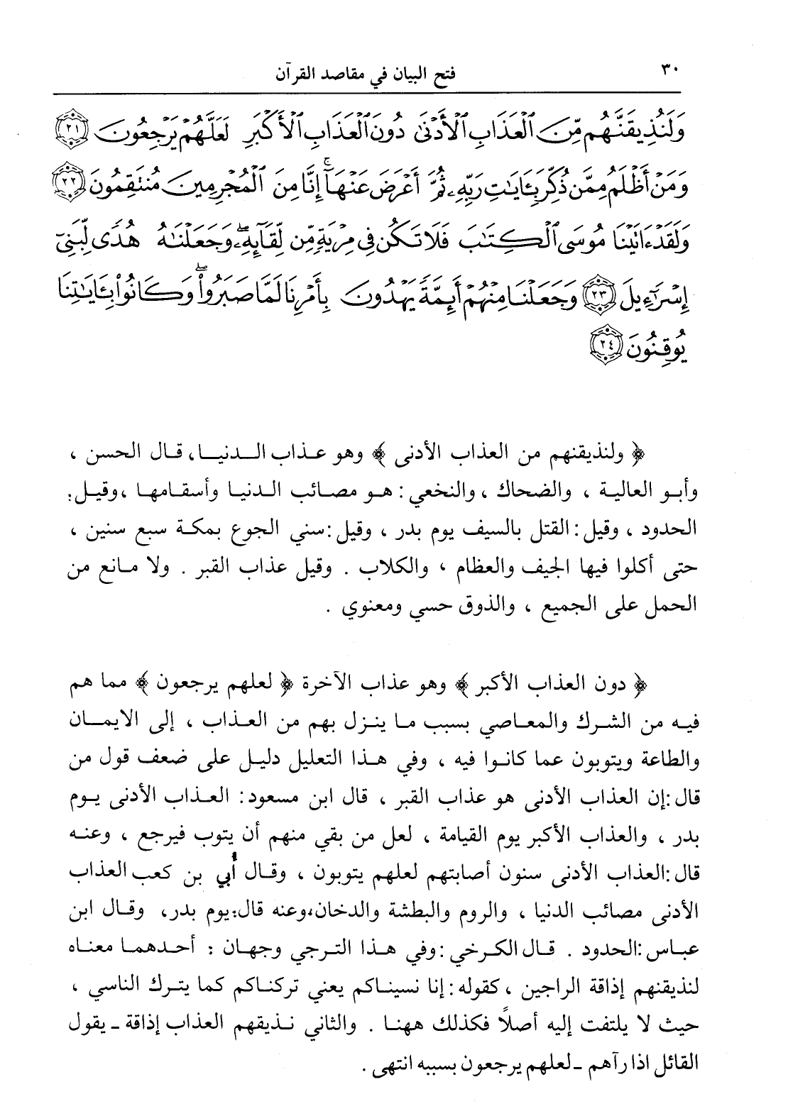 وَلَنُذِيقَنَّهُمْ مِنَ الْعَذَابِ الْأَدْنَى دُونَ الْعَذَابِ الْأَكْبَرِ لَعَلَّهُمْ يَرْجِعُونَ (21) وَمَنْ أَظْلَمُ مِمَّنْ ذُكِّرَ بِآيَاتِ رَبِّهِ ثُمَّ أَعْرَضَ عَنْهَا إِنَّا مِنَ الْمُجْرِمِينَ مُنْتَقِمُونَ (22) وَلَقَدْ آتَيْنَا مُوسَى الْكِتَابَ فَلَا تَكُنْ فِي مِرْيَةٍ مِنْ لِقَائِهِ وَجَعَلْنَاهُ هُدًى لِبَنِي إِسْرَائِيلَ (23) وَجَعَلْنَا مِنْهُمْ أَئِمَّةً يَهْدُونَ بِأَمْرِنَا لَمَّا صَبَرُوا وَكَانُوا بِآيَاتِنَا يُوقِنُونَ (24)
