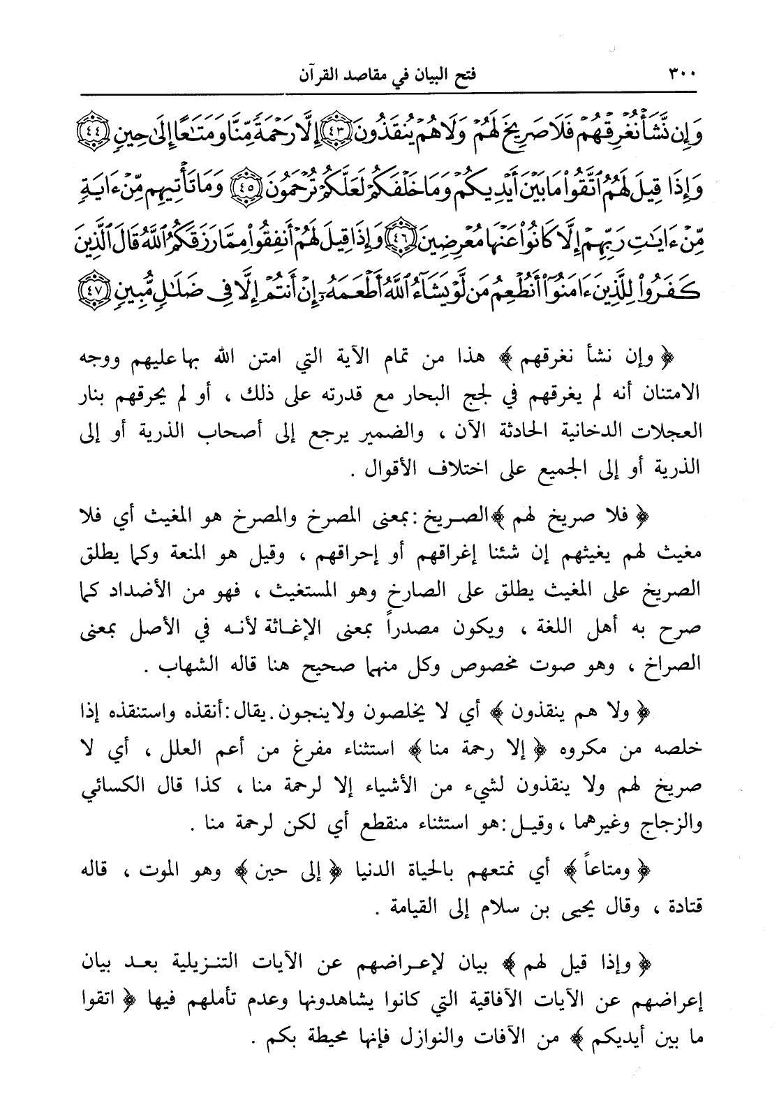 وَإِنْ نَشَأْ نُغْرِقْهُمْ فَلَا صَرِيخَ لَهُمْ وَلَا هُمْ يُنْقَذُونَ (43) إِلَّا رَحْمَةً مِنَّا وَمَتَاعًا إِلَى حِينٍ (44) وَإِذَا قِيلَ لَهُمُ اتَّقُوا مَا بَيْنَ أَيْدِيكُمْ وَمَا خَلْفَكُمْ لَعَلَّكُمْ تُرْحَمُونَ (45) وَمَا تَأْتِيهِمْ مِنْ آيَةٍ مِنْ آيَاتِ رَبِّهِمْ إِلَّا كَانُوا عَنْهَا مُعْرِضِينَ (46) وَإِذَا قِيلَ لَهُمْ أَنْفِقُوا مِمَّا رَزَقَكُمُ اللَّهُ قَالَ الَّذِينَ كَفَرُوا لِلَّذِينَ آمَنُوا أَنُطْعِمُ مَنْ لَوْ يَشَاءُ اللَّهُ أَطْعَمَهُ إِنْ أَنْتُمْ إِلَّا فِي ضَلَالٍ مُبِينٍ (47)