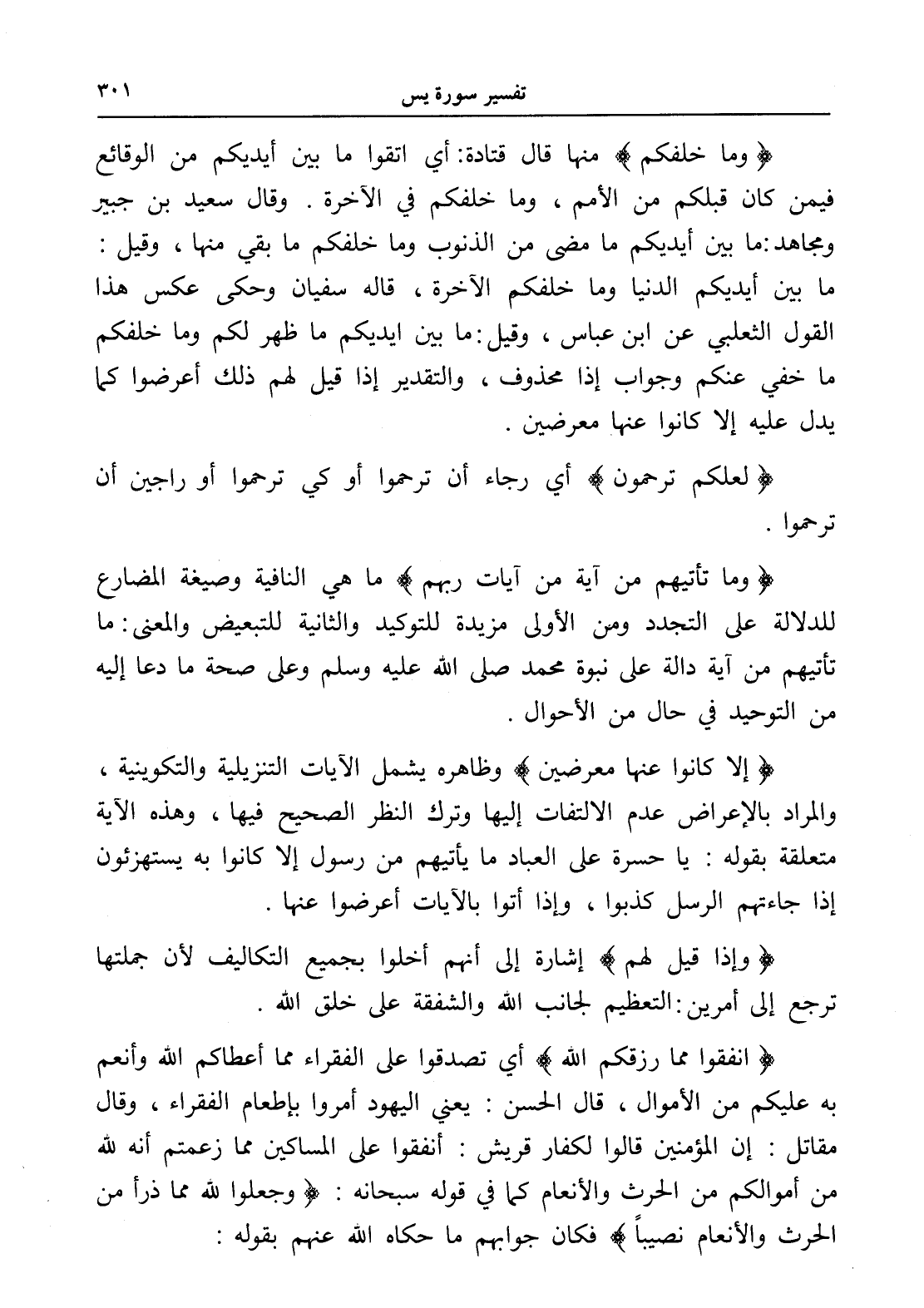 (وما خلفكم) منها قال قتادة: أي اتقوا ما بين أيديكم من الوقائع فيمن كان قبلكم من الأمم، وما خلفكم في الآخرة. وقال سعيد بن جبير ومجاهد: ما بين أيديكم ما مضى من الذنوب وما خلفكم ما بقي منها، وقيل: ما بين أيديكم الدنيا وما خلفكم الآخرة، قاله سفيان وحكى عكس هذا القول الثعلبي عن ابن عباس، وقيل: ما بين أيديكم ما ظهر لكم وما خلفكم ما خفي عنكم وجواب إذا محذوف، والتقدير إذا قيل لهم ذلك أعرضوا كما يدل عليه إلا كانوا عنها معرضين.