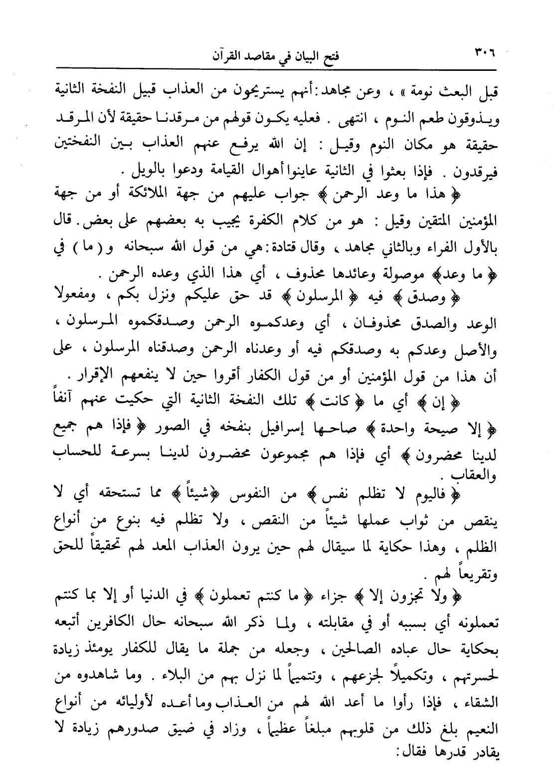 (إن) أي ما (كانت) تلك النفخة الثانية التي حكيت عنهم آنفاً (إلا صيحة واحدة) صاحها إسرافيل بنفخه في الصور (فإذا هم جميع لدينا محضرون) أي فإذا هم مجموعون محضرون لدينا بسرعة للحساب والعقاب.